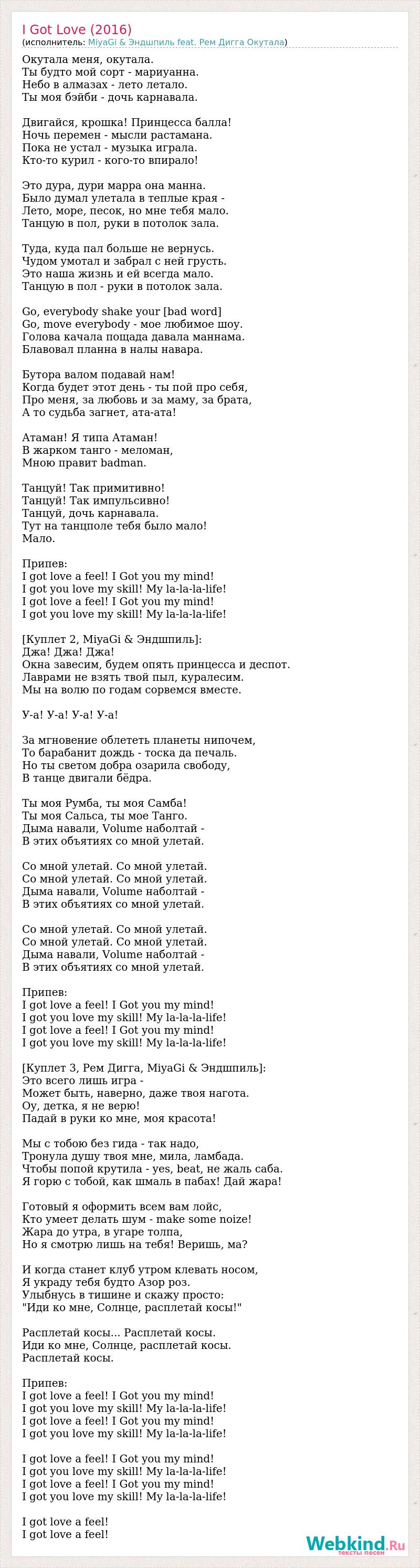 Окутала меня, окутала. Ты будто мой сорт - мариуанна. Небо в алмазах - лето летало. Ты моя бэйби - дочь карнавала. Двигайся, крошка! Принцесса балла! Ночь перемен - мысли растамана. Пока не устал - музыка играла. Кто-то курил - кого-то впирало! Это дура, дури марра она манна. Было думал улетала в теплые края - Лето, море, песок, но мне тебя мало. Танцую в пол, руки в потолок зала. Туда, куда пал больше не вернусь. Чудом умотал и забрал с ней грусть. Это наша жизнь и ей всегда мало. Танцую в пол - руки в потолок зала. Go, everybody shake your [bad word] Go, move everybody - мое любимое шоу. Голова качала пощада давала маннама. Блавовал планна в налы навара. Бутора валом подавай нам! Когда будет этот день - ты пой про себя, Про меня, за любовь и за маму, за брата, А то судьба загнет, ата-ата! Атаман! Я типа Атаман! В жарком танго - меломан, Мною правит badman. Танцуй! Так примитивно! Танцуй! Так импульсивно! Танцуй, дочь карнавала. Тут на танцполе тебя было мало! Мало. Припев: I got love a feel! I Got you my mind! I got you love my skill! My la-la-la-life! I got love a feel! I Got you my mind! I got you love my skill! My la-la-la-life! [Куплет 2, MiyaGi & Эндшпиль]: Джа! Джа! Джа! Окна завесим, будем опять принцесса и деспот. Лаврами не взять твой пыл, куралесим. Мы на волю по годам сорвемся вместе. У-а! У-а! У-а! У-а! За мгновение облететь планеты нипочем, То барабанит дождь - тоска да печаль. Но ты светом добра озарила свободу, В танце двигали бёдра. Ты моя Румба, ты моя Самба! Ты моя Сальса, ты мое Танго. Дыма навали, Volume наболтай - В этих объятиях со мной улетай. Со мной улетай. Со мной улетай. Со мной улетай. Со мной улетай. Дыма навали, Volume наболтай - В этих объятиях со мной улетай. Со мной улетай. Со мной улетай. Со мной улетай. Со мной улетай. Дыма навали, Volume наболтай - В этих объятиях со мной улетай. Припев: I got love a feel! I Got you my mind! I got you love my skill! My la-la-la-life! I got love a feel! I Got you my mind! I got you love my skill! My la-la-la-life! [Куплет 3, Рем Дигга, MiyaGi & Эндшпиль]: Это всего лишь игра - Может быть, наверно, даже твоя нагота. Оу, детка, я не верю! Падай в руки ко мне, моя красота! Мы с тобою без гида - так надо, Тронула душу твоя мне, мила, ламбада. Чтобы попой крутила - yes, beat, не жаль саба. Я горю с тобой, как шмаль в пабах! Дай жара! Готовый я оформить всем вам лойс, Кто умеет делать шум - make some noize! Жара до утра, в угаре толпа, Но я смотрю лишь на тебя! Веришь, ма? И когда станет клуб утром клевать носом, Я украду тебя будто Азор роз. Улыбнусь в тишине и скажу просто: "Иди ко мне, Солнце, расплетай косы!" Расплетай косы... Расплетай косы. Иди ко мне, Солнце, расплетай косы. Расплетай косы. Припев: I got love a feel! I Got you my mind! I got you love my skill! My la-la-la-life! I got love a feel! I Got you my mind! I got you love my skill! My la-la-la-life! I got love a feel! I Got you my mind! I got you love my skill! My la-la-la-life! I got love a feel! I Got you my mind! I got you love my skill! My la-la-la-life! I got love a feel! I got love a feel!