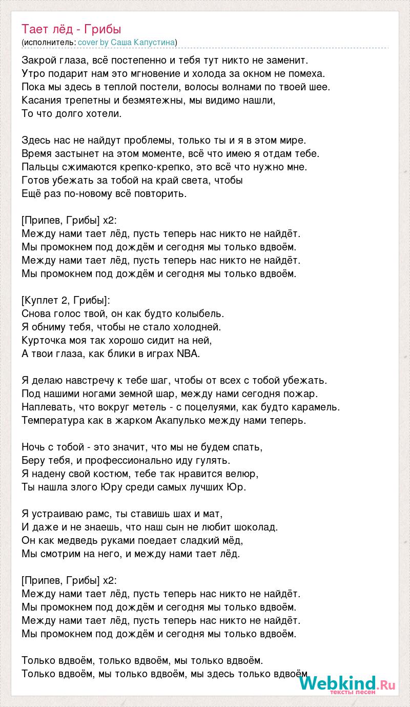 Закрой глаза, всё постепенно и тебя тут никто не заменит. Утро подарит нам это мгновение и холода за окном не помеха. Пока мы здесь в теплой постели, волосы волнами по твоей шее. Касания трепетны и безмятежны, мы видимо нашли, То что долго хотели. Здесь нас не найдут проблемы, только ты и я в этом мире. Время застынет на этом моменте, всё что имею я отдам тебе. Пальцы сжимаются крепко-крепко, это всё что нужно мне. Готов убежать за тобой на край света, чтобы Ещё раз по-новому всё повторить. [Припев, Грибы] x2: Между нами тает лёд, пусть теперь нас никто не найдёт. Мы промокнем под дождём и сегодня мы только вдвоём. Между нами тает лёд, пусть теперь нас никто не найдёт. Мы промокнем под дождём и сегодня мы только вдвоём. [Куплет 2, Грибы]: Снова голос твой, он как будто колыбель. Я обниму тебя, чтобы не стало холодней. Курточка моя так хорошо сидит на ней, А твои глаза, как блики в играх NBA. Я делаю навстречу к тебе шаг, чтобы от всех с тобой убежать. Под нашими ногами земной шар, между нами сегодня пожар. Наплевать, что вокруг метель - с поцелуями, как будто карамель. Температура как в жарком Акапулько между нами теперь. Ночь с тобой - это значит, что мы не будем спать, Беру тебя, и профессионально иду гулять. Я надену свой костюм, тебе так нравится велюр, Ты нашла злого Юру среди самых лучших Юр. Я устраиваю рамс, ты ставишь шах и мат, И даже и не знаешь, что наш сын не любит шоколад. Он как медведь руками поедает сладкий мёд, Мы смотрим на него, и между нами тает лёд. [Припев, Грибы] x2: Между нами тает лёд, пусть теперь нас никто не найдёт. Мы промокнем под дождём и сегодня мы только вдвоём. Между нами тает лёд, пусть теперь нас никто не найдёт. Мы промокнем под дождём и сегодня мы только вдвоём. Только вдвоём, только вдвоём, мы только вдвоём. Только вдвоём, мы только вдвоём, мы здесь только вдвоём.