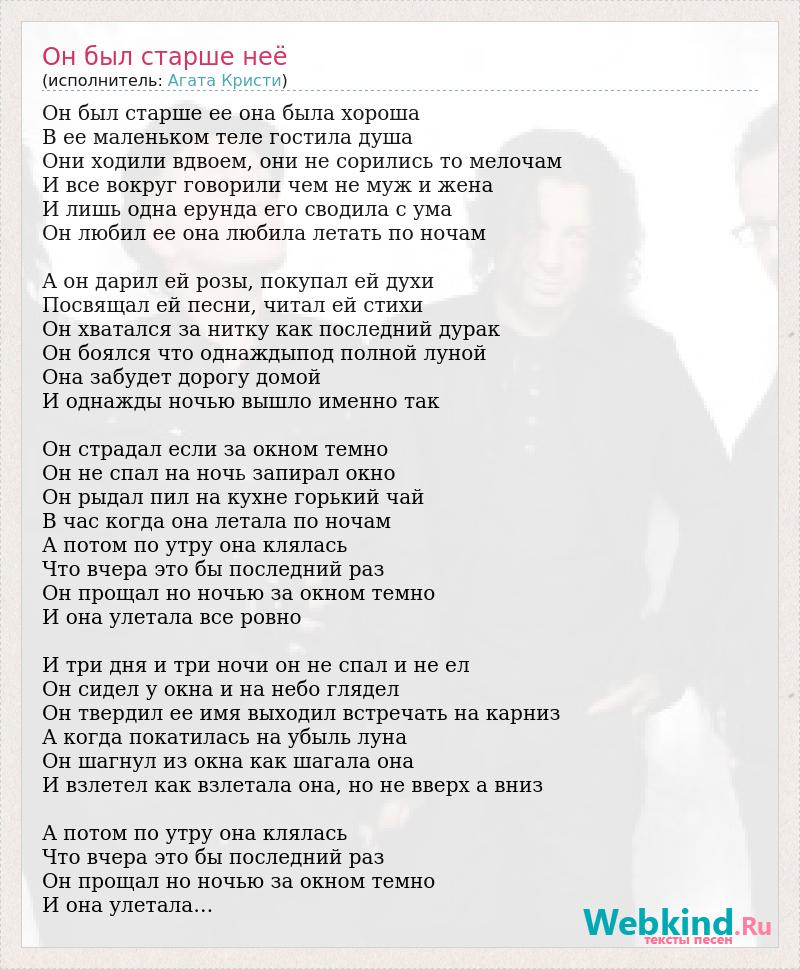 Он был старше ее она была хороша В ее маленьком теле гостила душа Они ходили вдвоем, они не сорились то мелочам И все вокруг говорили чем не муж и жена И лишь одна ерунда его сводила с ума Он любил ее она любила летать по ночам А он дарил ей розы, покупал ей духи Посвящал ей песни, читал ей стихи Он хватался за нитку как последний дурак Он боялся что однаждыпод полной луной Она забудет дорогу домой И однажды ночью вышло именно так Он страдал если за окном темно Он не спал на ночь запирал окно Он рыдал пил на кухне горький чай В час когда она летала по ночам А потом по утру она клялась Что вчера это бы последний раз Он прощал но ночью за окном темно И она улетала все ровно И три дня и три ночи он не спал и не ел Он сидел у окна и на небо глядел Он твердил ее имя выходил встречать на карниз А когда покатилась на убыль луна Он шагнул из окна как шагала она И взлетел как взлетала она, но не вверх а вниз А потом по утру она клялась Что вчера это бы последний раз Он прощал но ночью за окном темно И она улетала…