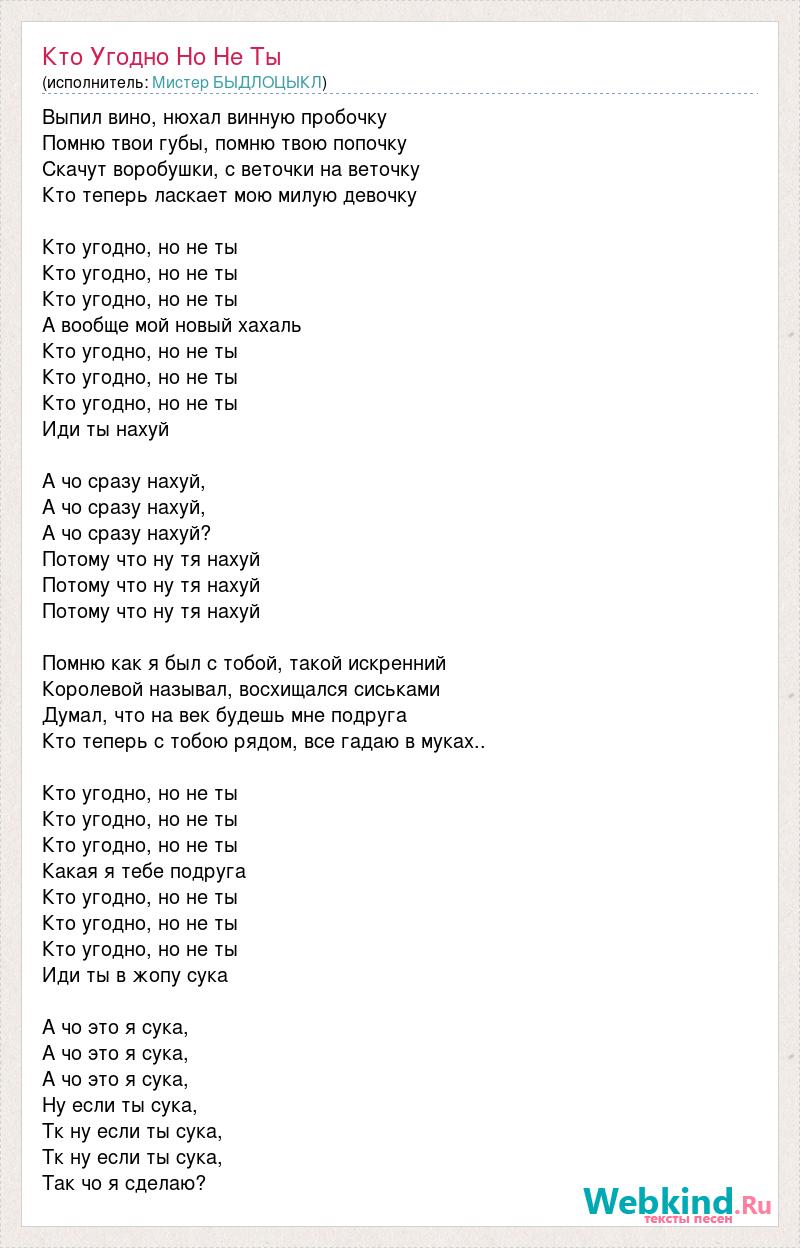 Выпил вино, нюхал винную пробочку Помню твои губы, помню твою попочку Скачут воробушки, с веточки на веточку Кто теперь ласкает мою милую девочку Кто угодно, но не ты Кто угодно, но не ты Кто угодно, но не ты А вообще мой новый хахаль Кто угодно, но не ты Кто угодно, но не ты Кто угодно, но не ты Иди ты нахуй А чо сразу нахуй, А чо сразу нахуй, А чо сразу нахуй? Потому что ну тя нахуй Потому что ну тя нахуй Потому что ну тя нахуй Помню как я был с тобой, такой искренний Королевой называл, восхищался сиськами Думал, что на век будешь мне подруга Кто теперь с тобою рядом, все гадаю в муках.. Кто угодно, но не ты Кто угодно, но не ты Кто угодно, но не ты Какая я тебе подруга Кто угодно, но не ты Кто угодно, но не ты Кто угодно, но не ты Иди ты в жопу сука А чо это я сука, А чо это я сука, А чо это я сука, Ну если ты сука, Тк ну если ты сука, Тк ну если ты сука, Так чо я сделаю?