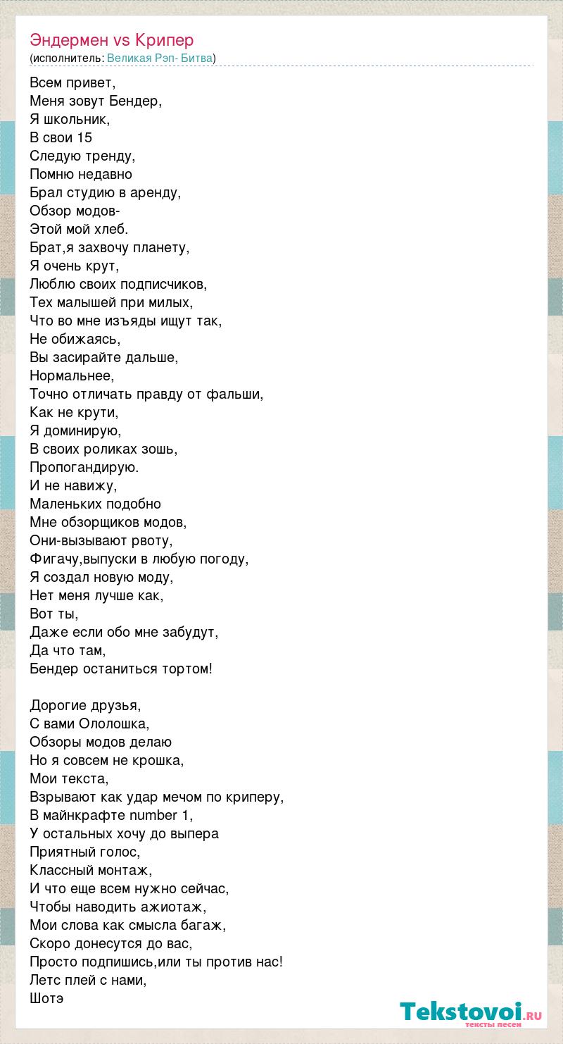 Всем привет, Меня зовут Бендер, Я школьник, В свои 15 Следую тренду, Помню недавно Брал студию в аренду, Обзор модов- Этой мой хлеб. Брат,я захвочу планету, Я очень крут, Люблю своих подписчиков, Тех малышей при милых, Что во мне изъяды ищут так, Не обижаясь, Вы засирайте дальше, Нормальнее, Точно отличать правду от фальши, Как не крути, Я доминирую, В своих роликах зошь, Пропогандирую. И не навижу, Маленьких подобно Мне обзорщиков модов, Они-вызывают рвоту, Фигачу,выпуски в любую погоду, Я создал новую моду, Нет меня лучше как, Вот ты, Даже если обо мне забудут, Да что там, Бендер останиться тортом! Дорогие друзья, С вами Ололошка, Обзоры модов делаю Но я совсем не крошка, Мои текста, Взрывают как удар мечом по криперу, В майнкрафте number 1, У остальных хочу до выпера Приятный голос, Классный монтаж, И что еще всем нужно сейчас, Чтобы наводить ажиотаж, Мои слова как смысла багаж, Скоро донесутся до вас, Просто подпишись,или ты против нас! Летс плей с нами, Шотэ