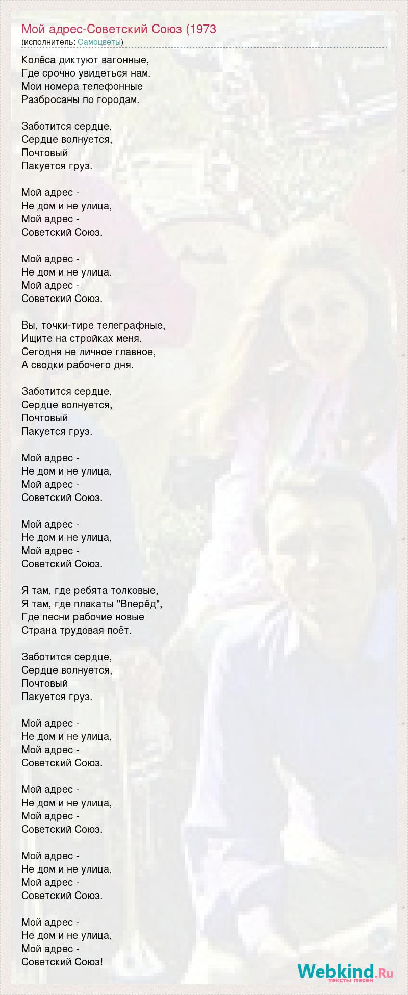 Колёса диктуют вагонные, Где срочно увидеться нам. Мои номера телефонные Разбросаны по городам. Заботится сердце, Сердце волнуется, Почтовый Пакуется груз. Мой адрес - Не дом и не улица, Мой адрес - Советский Союз. Мой адрес - Не дом и не улица. Мой адрес - Советский Союз. Вы, точки-тире телеграфные, Ищите на стройках меня. Сегодня не личное главное, А сводки рабочего дня. Заботится сердце, Сердце волнуется, Почтовый Пакуется груз. Мой адрес - Не дом и не улица, Мой адрес - Советский Союз. Мой адрес - Не дом и не улица, Мой адрес - Советский Союз. Я там, где ребята толковые, Я там, где плакаты "Вперёд", Где песни рабочие новые Страна трудовая поёт. Заботится сердце, Сердце волнуется, Почтовый Пакуется груз. Мой адрес - Не дом и не улица, Мой адрес - Советский Союз. Мой адрес - Не дом и не улица, Мой адрес - Советский Союз. Мой адрес - Не дом и не улица, Мой адрес - Советский Союз. Мой адрес - Не дом и не улица, Мой адрес - Советский Союз!
