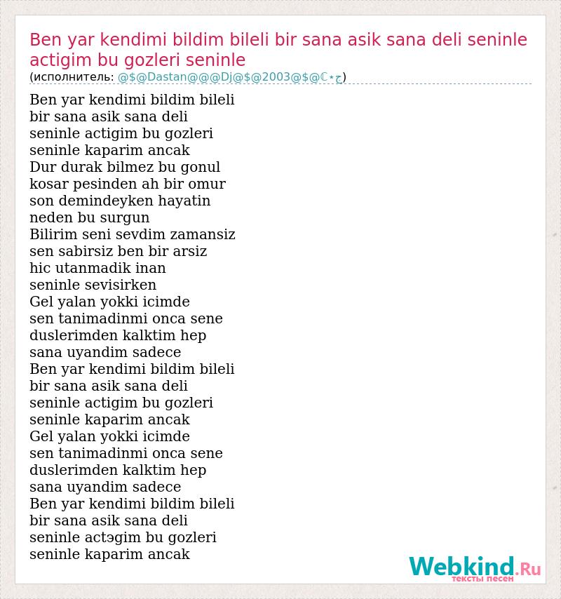 А как ты думаешь, о чем песня "Ben yar kendimi bildim bileli bir sana asik sana deli seninle actigim bu" ?