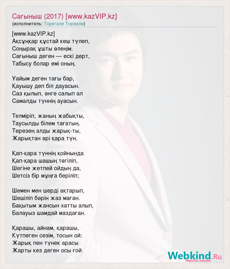[www.kazVIP.kz] Ақсұңқар құстай кеш түлеп, Соңырақ ұшты өлеңім. Сағыныш деген — ескі дерт, Табысу болар емі оның. Уайым деген тағы бар, Қауышу деп біл дауасын. Саз қылып, әнге салып ал Самалды түннің ауасын. Телміріп, жаның жабықты, Таусылды білем тағатың. Терезең алды жарық-ты, Жарықтан әрі қара түн. Қап-қара түннің қойнында Қап-қара шашың төгіліп, Шегіне жетпей ойдың да, Шетсіз бір мұңға беріліп; Шемен мен шерді ақтарып, Шешіліп бәрін жаз маған. Бақытым жансын хатты алып, Балауыз шамдай маздаған. Қарашы, айнам, қарашы, Күтпеген сезім, тосын ой: Жарық пен түнек арасы Жарты кез деген осы ғой