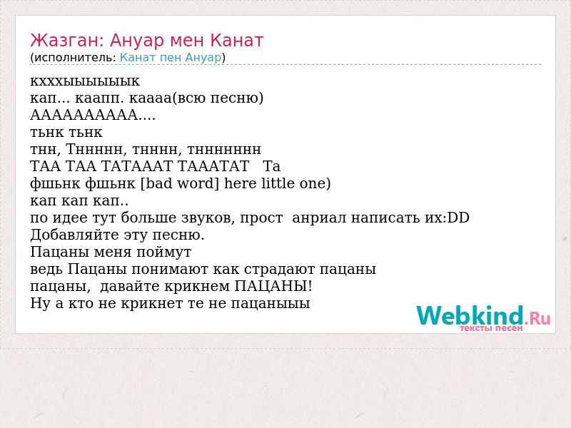 кхххыыыыыык кап... каапп. каааа(всю песню) АААААААААА.... тьнк тьнк тнн, Тннннн, тнннн, тннннннн ТАА ТАА ТАТАААТ ТАААТАТ Та фшьнк фшьнк [bad word] here little one) кап кап кап.. по идее тут больше звуков, прост анриал написать их:DD Добавляйте эту песню. Пацаны меня поймут ведь Пацаны понимают как страдают пацаны пацаны, давайте крикнем ПАЦАНЫ! Ну а кто не крикнет те не пацаныыы