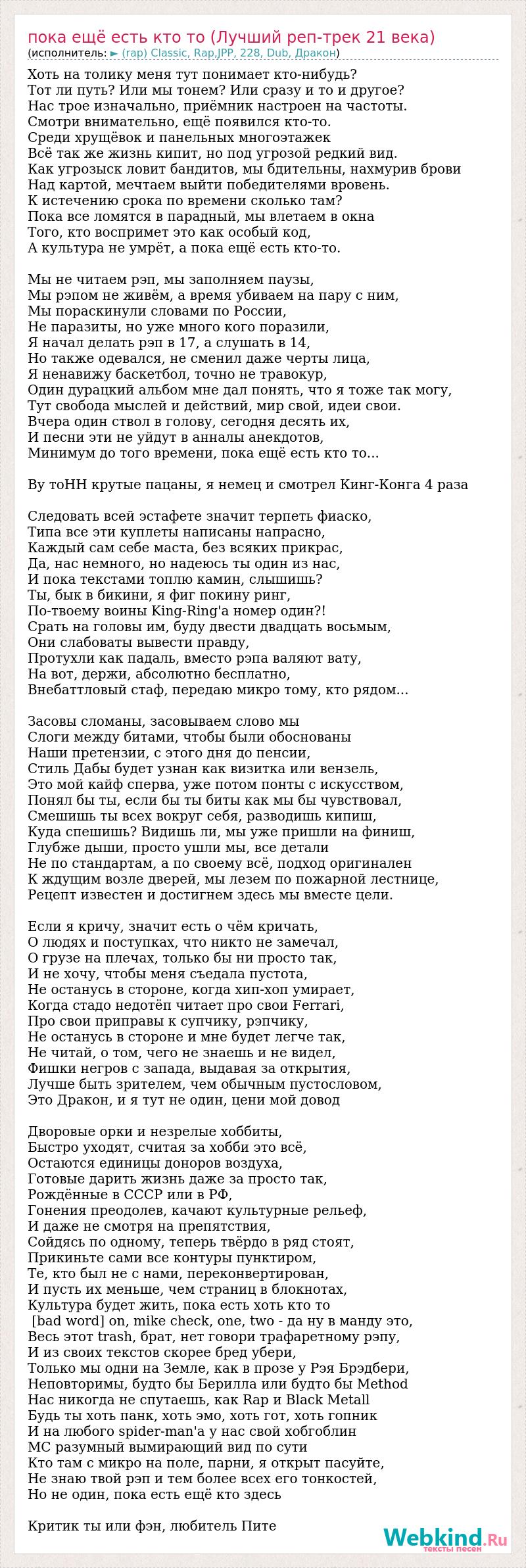 Хоть на толику меня тут понимает кто-нибудь? Тот ли путь? Или мы тонем? Или сразу и то и другое? Нас трое изначально, приёмник настроен на частоты. Смотри внимательно, ещё появился кто-то. Среди хрущёвок и панельных многоэтажек Всё так же жизнь кипит, но под угрозой редкий вид. Как угрозыск ловит бандитов, мы бдительны, нахмурив брови Над картой, мечтаем выйти победителями вровень. К истечению срока по времени сколько там? Пока все ломятся в парадный, мы влетаем в окна Того, кто воспримет это как особый код, А культура не умрёт, а пока ещё есть кто-то. Мы не читаем рэп, мы заполняем паузы, Мы рэпом не живём, а время убиваем на пару с ним, Мы пораскинули словами по России, Не паразиты, но уже много кого поразили, Я начал делать рэп в 17, а слушать в 14, Но также одевался, не сменил даже черты лица, Я ненавижу баскетбол, точно не травокур, Один дурацкий альбом мне дал понять, что я тоже так могу, Тут свобода мыслей и действий, мир свой, идеи свои. Вчера один ствол в голову, сегодня десять их, И песни эти не уйдут в анналы анекдотов, Минимум до того времени, пока ещё есть кто то... Ву тоНН крутые пацаны, я немец и смотрел Кинг-Конга 4 раза Следовать всей эстафете значит терпеть фиаско, Типа все эти куплеты написаны напрасно, Каждый сам себе маста, без всяких прикрас, Да, нас немного, но надеюсь ты один из нас, И пока текстами топлю камин, слышишь? Ты, бык в бикини, я фиг покину ринг, По-твоему воины King-Ring'а номер один?! Срать на головы им, буду двести двадцать восьмым, Они слабоваты вывести правду, Протухли как падаль, вместо рэпа валяют вату, На вот, держи, абсолютно бесплатно, Внебаттловый стаф, передаю микро тому, кто рядом... Засовы сломаны, засовываем слово мы Слоги между битами, чтобы были обоснованы Наши претензии, с этого дня до пенсии, Стиль Дабы будет узнан как визитка или вензель, Это мой кайф сперва, уже потом понты с искусством, Понял бы ты, если бы ты биты как мы бы чувствовал, Смешишь ты всех вокруг себя, разводишь кипиш, Куда спешишь? Видишь ли, мы уже пришли на финиш, Глубже дыши, просто ушли мы, все детали Не по стандартам, а по своему всё, подход оригинален К ждущим возле дверей, мы лезем по пожарной лестнице, Рецепт известен и достигнем здесь мы вместе цели. Если я кричу, значит есть о чём кричать, О людях и поступках, что никто не замечал, О грузе на плечах, только бы ни просто так, И не хочу, чтобы меня съедала пустота, Не останусь в стороне, когда хип-хоп умирает, Когда стадо недотёп читает про свои Ferrari, Про свои приправы к супчику, рэпчику, Не останусь в стороне и мне будет легче так, Не читай, о том, чего не знаешь и не видел, Фишки негров с запада, выдавая за открытия, Лучше быть зрителем, чем обычным пустословом, Это Дракон, и я тут не один, цени мой довод Дворовые орки и незрелые хоббиты, Быстро уходят, считая за хобби это всё, Остаются единицы доноров воздуха, Готовые дарить жизнь даже за просто так, Рождённые в СССР или в РФ, Гонения преодолев, качают культурные рельеф, И даже не смотря на препятствия, Сойдясь по одному, теперь твёрдо в ряд стоят, Прикиньте сами все контуры пунктиром, Те, кто был не с нами, переконвертирован, И пусть их меньше, чем страниц в блокнотах, Культура будет жить, пока есть хоть кто то [bad word] on, mike check, one, two - да ну в манду это, Весь этот trash, брат, нет говори трафаретному рэпу, И из своих текстов скорее бред убери, Только мы одни на Земле, как в прозе у Рэ
