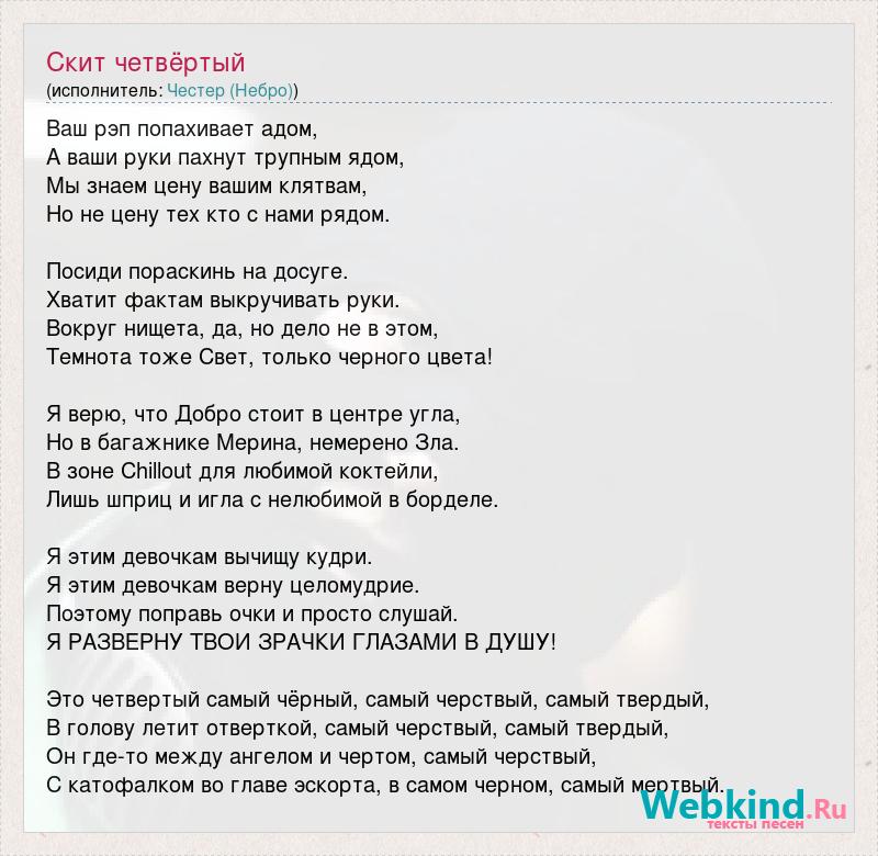 Ваш рэп попахивает адом, А ваши руки пахнут трупным ядом, Мы знаем цену вашим клятвам, Но не цену тех кто с нами рядом. Посиди пораскинь на досуге. Хватит фактам выкручивать руки. Вокруг нищета, да, но дело не в этом, Темнота тоже Свет, только черного цвета! Я верю, что Добро стоит в центре угла, Но в багажнике Мерина, немерено Зла. В зоне Chillout для любимой коктейли, Лишь шприц и игла с нелюбимой в борделе. Я этим девочкам вычищу кудри. Я этим девочкам верну целомудрие. Поэтому поправь очки и просто слушай. Я РАЗВЕРНУ ТВОИ ЗРАЧКИ ГЛАЗАМИ В ДУШУ! Это четвертый самый чёрный, самый черствый, самый твердый, В голову летит отверткой, самый черствый, самый твердый, Он где-то между ангелом и чертом, самый черствый, С катофалком во главе эскорта, в самом черном, самый мертвый.