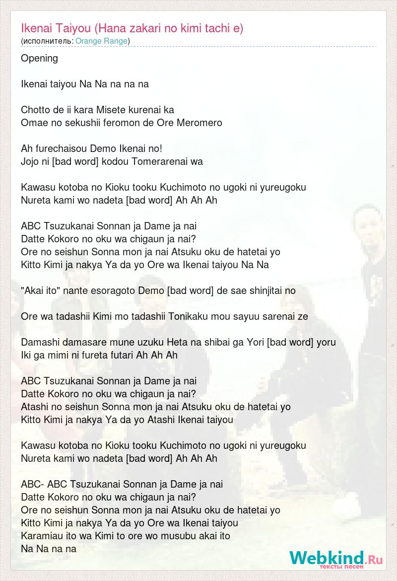 Opening Ikenai taiyou Na Na na na na Chotto de ii kara Misete kurenai ka Omae no sekushii feromon de Ore Meromero Ah furechaisou Demo Ikenai no! Jojo ni [bad word] kodou Tomerarenai wa Kawasu kotoba no Kioku tooku Kuchimoto no ugoki ni yureugoku Nureta kami wo nadeta [bad word] Ah Ah Ah ABC Tsuzukanai Sonnan ja Dame ja nai Datte Kokoro no oku wa chigaun ja nai? Ore no seishun Sonna mon ja nai Atsuku oku de hatetai yo Kitto Kimi ja nakya Ya da yo Ore wa Ikenai taiyou Na Na "Akai ito" nante esoragoto Demo [bad word] de sae shinjitai no Ore wa tadashii Kimi mo tadashii Tonikaku mou sayuu sarenai ze Damashi damasare mune uzuku Heta na shibai ga Yori [bad word] yoru Iki ga mimi ni fureta futari Ah Ah Ah ABC Tsuzukanai Sonnan ja Dame ja nai Datte Kokoro no oku wa chigaun ja nai? Atashi no seishun Sonna mon ja nai Atsuku oku de hatetai yo Kitto Kimi ja nakya Ya da yo Atashi Ikenai taiyou Kawasu kotoba no Kioku tooku Kuchimoto no ugoki ni yureugoku Nureta kami wo nadeta [bad word] Ah Ah Ah ABC- ABC Tsuzukanai Sonnan ja Dame ja nai Datte Kokoro no oku wa chigaun ja nai? Ore no seishun Sonna mon ja nai Atsuku oku de hatetai yo Kitto Kimi ja nakya Ya da yo Ore wa Ikenai taiyou Karamiau ito wa Kimi to ore wo musubu akai ito Na Na na na