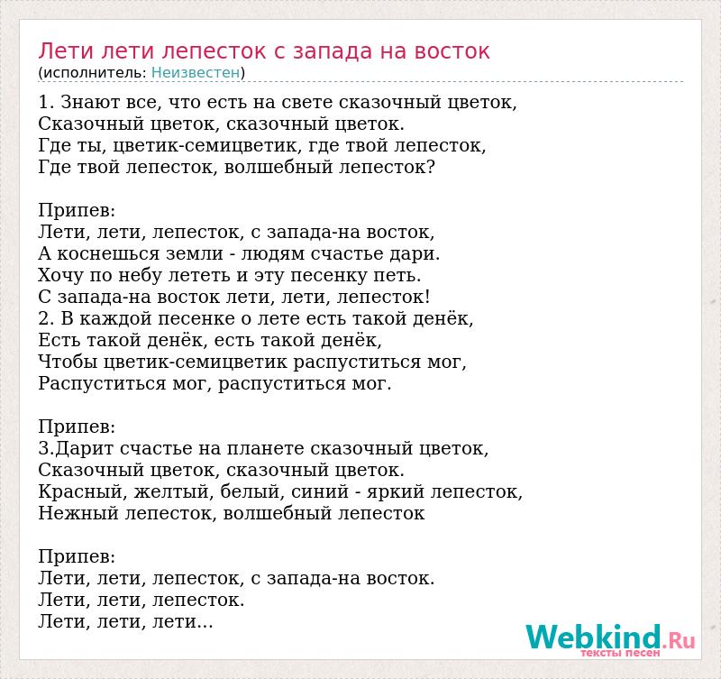 1. Знают все, что есть на свете сказочный цветок, Сказочный цветок, сказочный цветок. Где ты, цветик-семицветик, где твой лепесток, Где твой лепесток, волшебный лепесток? Припев: Лети, лети, лепесток, с запада-на восток, А коснешься земли - людям счастье дари. Хочу по небу лететь и эту песенку петь. С запада-на восток лети, лети, лепесток! 2. В каждой песенке о лете есть такой денёк, Есть такой денёк, есть такой денёк, Чтобы цветик-семицветик распуститься мог, Распуститься мог, распуститься мог. Припев: 3.Дарит счастье на планете сказочный цветок, Сказочный цветок, сказочный цветок. Красный, желтый, белый, синий - яркий лепесток, Нежный лепесток, волшебный лепесток Припев: Лети, лети, лепесток, с запада-на восток. Лети, лети, лепесток. Лети, лети, лети...