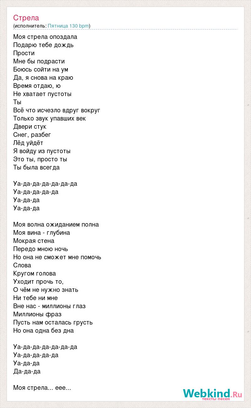 Моя стрела опоздала Подарю тебе дождь Прости Мне бы подрасти Боюсь сойти на ум Да, я снова на краю Время отдаю, ю Не хватает пустоты Ты Всё что исчезло вдруг вокруг Только звук упавших век Двери стук Снег, разбег Лёд уйдёт Я войду из пустоты Это ты, просто ты Ты была всегда Уа-да-да-да-да-да-да Уа-да-да-да-да Уа-да-да Уа-да-да Моя волна ожиданием полна Моя вина - глубина Мокрая стена Передо мною ночь Но она не сможет мне помочь Слова Кругом голова Уходит прочь то, О чём не нужно знать Ни тебе ни мне Вне нас - миллионы глаз Миллионы фраз Пусть нам осталась грусть Но она одна без дна Уа-да-да-да-да-да-да Уа-да-да-да-да Уа-да-да Да-да-да Моя стрела... еее...