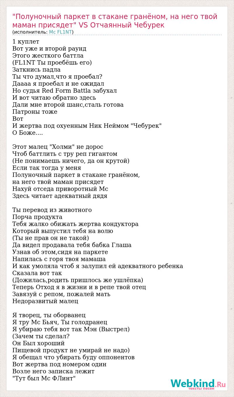 1 куплет Вот уже и второй раунд Этого жесткого баттла (FL1NT Ты проебёшь его) Заткнись падла Ты что думал,что я проебал? Даааа я проебал и не ожидал Но судья Red Form Battla забухал И вот читаю обратно здесь Дали мне второй шанс,сталь готова Патроны тоже Вот И жертва под охуенным Ник Неймом "Чебурек" О Боже.... Этот малец "Холми" не дорос Чтоб баттлить с тру реп гигантом (Не понимаешь ничего, да он крутой) Если так тогда у меня Полуночный паркет в стакане гранёном, на него твой маман присядет Нахуй отседа приворотный Мс Здесь читает адекватный дядя Ты перевод из животного Порча продукта Тебя жалко обижать жертва кондуктора Который выпустил тебя на волю (Ты не прав он не такой) Да видел продавала тебя бабка Глаша Узнав об этом,сидя на паркете Напилась с горя твоя мамаша И как умоляла чтоб я залупил ей адекватного ребенка Сказала вот так (Дожилась,родить пришлось же ушлёпка) Теперь Отход я в жизни и в репе твой отец Завязуй с репом, пожалей мать Недоразвитый малец Я творец, ты оборванец Я тру Мс Бьяч, Ты голодранец Я убираю тебя вот так Мэн (Выстрел) (Зачем ты сделал? Он Был хороший Пищевой продукт не умирай не надо) Я обещал что убирать буду оппонентов Вот жертва под номером один Возле него записка лежит "Тут был Мс ФЛинт"