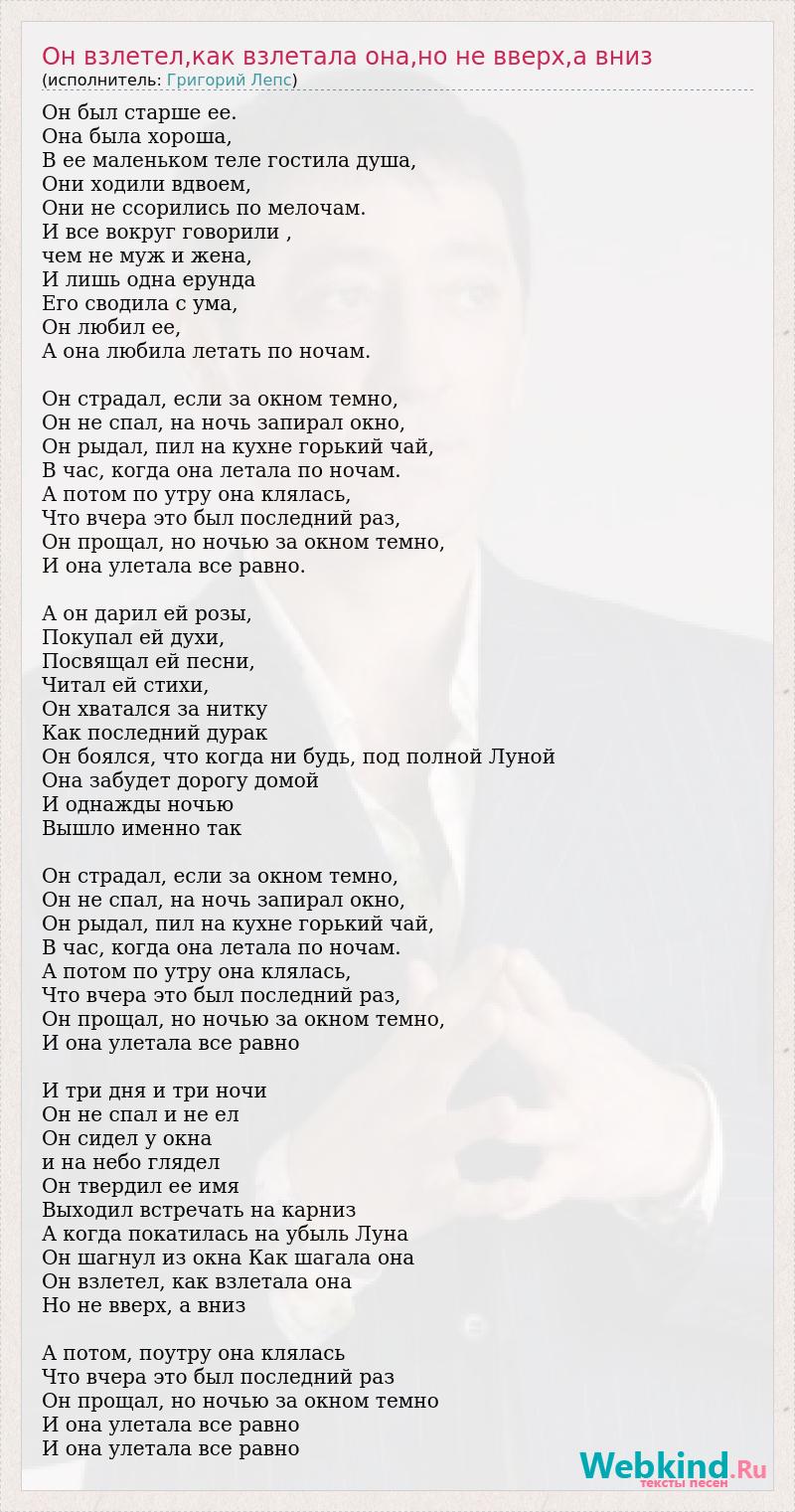 Он был старше ее. Она была хороша, В ее маленьком теле гостила душа, Они ходили вдвоем, Они не ссорились по мелочам. И все вокруг говорили , чем не муж и жена, И лишь одна ерунда Его сводила с ума, Он любил ее, А она любила летать по ночам. Он страдал, если за окном темно, Он не спал, на ночь запирал окно, Он рыдал, пил на кухне горький чай, В час, когда она летала по ночам. А потом по утру она клялась, Что вчера это был последний раз, Он прощал, но ночью за окном темно, И она улетала все равно. А он дарил ей розы, Покупал ей духи, Посвящал ей песни, Читал ей стихи, Он хватался за нитку Как последний дурак Он боялся, что когда ни будь, под полной Луной Она забудет дорогу домой И однажды ночью Вышло именно так Он страдал, если за окном темно, Он не спал, на ночь запирал окно, Он рыдал, пил на кухне горький чай, В час, когда она летала по ночам. А потом по утру она клялась, Что вчера это был последний раз, Он прощал, но ночью за окном темно, И она улетала все равно И три дня и три ночи Он не спал и не ел Он сидел у окна и на небо глядел Он твердил ее имя Выходил встречать на карниз А когда покатилась на убыль Луна Он шагнул из окна Как шагала она Он взлетел, как взлетала она Но не вверх, а вниз А потом, поутру она клялась Что вчера это был последний раз Он прощал, но ночью за окном темно И она улетала все равно И она улетала все равно