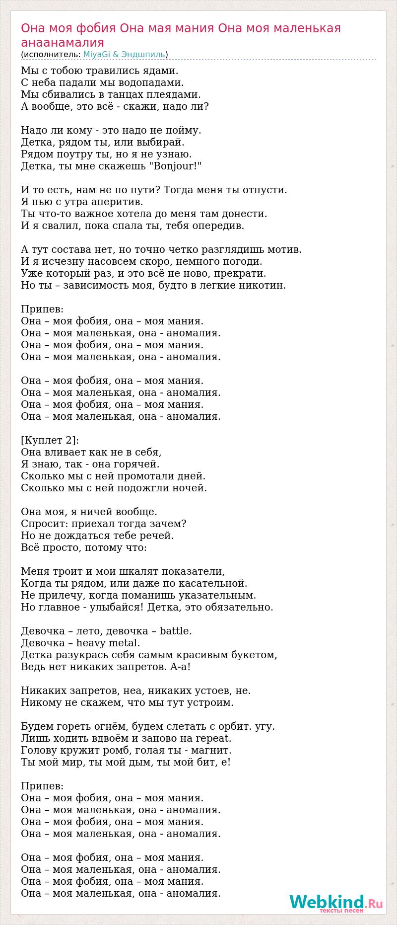 Мы с тобою травились ядами. С неба падали мы водопадами. Мы сбивались в танцах плеядами. А вообще, это всё - скажи, надо ли? Надо ли кому - это надо не пойму. Детка, рядом ты, или выбирай. Рядом поутру ты, но я не узнаю. Детка, ты мне скажешь "Bonjour!" И то есть, нам не по пути? Тогда меня ты отпусти. Я пью с утра аперитив. Ты что-то важное хотела до меня там донести. И я свалил, пока спала ты, тебя опередив. А тут состава нет, но точно четко разглядишь мотив. И я исчезну насовсем скоро, немного погоди. Уже который раз, и это всё не ново, прекрати. Но ты – зависимость моя, будто в легкие никотин. Припев: Она – моя фобия, она – моя мания. Она – моя маленькая, она - аномалия. Она – моя фобия, она – моя мания. Она – моя маленькая, она - аномалия. Она – моя фобия, она – моя мания. Она – моя маленькая, она - аномалия. Она – моя фобия, она – моя мания. Она – моя маленькая, она - аномалия. [Куплет 2]: Она вливает как не в себя, Я знаю, так - она горячей. Сколько мы с ней промотали дней. Сколько мы с ней подожгли ночей. Она моя, я ничей вообще. Спросит: приехал тогда зачем? Но не дождаться тебе речей. Всё просто, потому что: Меня троит и мои шкалят показатели, Когда ты рядом, или даже по касательной. Не прилечу, когда поманишь указательным. Но главное - улыбайся! Детка, это обязательно. Девочка – лето, девочка – battle. Девочка – heavy metal. Детка разукрась себя самым красивым букетом, Ведь нет никаких запретов. А-а! Никаких запретов, неа, никаких устоев, не. Никому не скажем, что мы тут устроим. Будем гореть огнём, будем слетать с орбит. угу. Лишь ходить вдвоём и заново на repeat. Голову кружит ромб, голая ты - магнит. Ты мой мир, ты мой дым, ты мой бит, е! Припев: Она – моя фобия, она – моя мания. Она – моя маленькая, она - аномалия. Она – моя фобия, она – моя мания. Она – моя маленькая, она - аномалия. Она – моя фобия, она – моя мания. Она – моя маленькая, она - аномалия. Она – моя фобия, она – моя мания. Она – моя маленькая, она - аномалия.