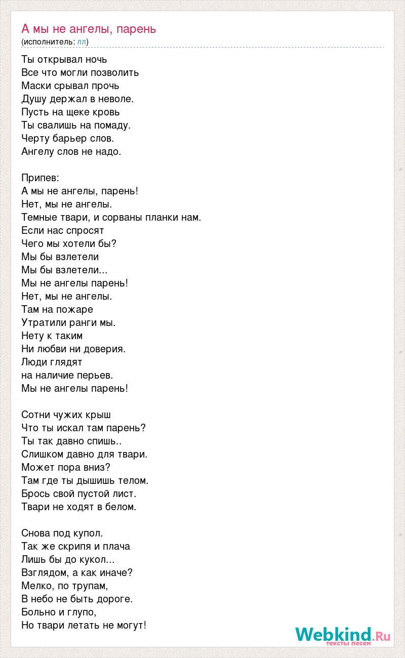 Ты открывал ночь Все что могли позволить Маски срывал прочь Душу держал в неволе. Пусть на щеке кровь Ты свалишь на помаду. Черту барьер слов. Ангелу слов не надо. Припев: А мы не ангелы, парень! Нет, мы не ангелы. Темные твари, и сорваны планки нам. Если нас спросят Чего мы хотели бы? Мы бы взлетели Мы бы взлетели... Мы не ангелы парень! Нет, мы не ангелы. Там на пожаре Утратили ранги мы. Нету к таким Ни любви ни доверия. Люди глядят на наличие перьев. Мы не ангелы парень! Сотни чужих крыш Что ты искал там парень? Ты так давно спишь.. Слишком давно для твари. Может пора вниз? Там где ты дышишь телом. Брось свой пустой лист. Твари не ходят в белом. Снова под купол. Так же скрипя и плача Лишь бы до кукол... Взглядом, а как иначе? Мелко, по трупам, В небо не быть дороге. Больно и глупо, Но твари летать не могут!