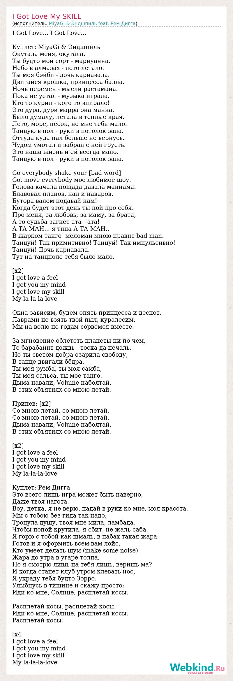 I Got Love... I Got Love... Куплет: MiyaGi & Эндшпиль Окутала меня, окутала. Ты будто мой сорт - мариуанна. Небо в алмазах - лето летало. Ты моя бэйби - дочь карнавала. Двигайся крошка, принцесса балла. Ночь перемен - мысли растамана. Пока не устал - музыка играла. Кто то курил - кого то впирало! Это дура, дури марра она манна. Было думалу, летала в теплые края. Лето, море, песок, но мне тебя мало. Танцую в пол - руки в потолок зала. Оттуда куда пал больше не вернусь. Чудом умотал и забрал с ней грусть. Это наша жизнь и ей всегда мало. Танцую в пол - руки в потолок зала. Go everybody shake your [bad word] Go, move everybody мое любимое шоу. Голова качала пощада давала маннама. Блавовал планов, нал и наваров. Бутора валом подавай нам! Когда будет этот день ты пой про себя. Про меня, за любовь, за маму, за брата, А то судьба загнет ата - ата! А-ТА-МАН... я типа А-ТА-МАН.. В жарком танго- меломан мною правит bad man. Танцуй! Так примитивно! Танцуй! Так импульсивно! Танцуй! Дочь карнавала. Тут на танцполе тебя было мало. [x2] I got love a feel I got you my mind I got love my skill My la-la-la-love Окна зависим, будем опять принцесса и деспот. Лаврами не взять твой пыл, куралесим. Мы на волю по годам сорвемся вместе. За мгновение облететь планеты ни по чем, То барабанит дождь - тоска да печаль. Но ты светом добра озарила свободу, В танце двигали бёдра. Ты моя румба, ты моя самба, Ты моя сальса, ты мое танго. Дыма навали, Volume наболтай, В этих объятиях со мною летай. Припев: [х2] Со мною летай, со мною летай. Со мною летай, со мною летай. Дыма навали, Volume наболтай, В этих объятиях со мною летай. [х2] I got love a feel I got you my mind I got love my skill My la-la-la-love Куплет: Рем Дигга Это всего лишь игра может быть наверно, Даже твоя нагота. Воу, детка, я не верю, падай в руки ко мне, моя красота. Мы с тобою без гида так надо, Тронула душу, твоя мне мила, ламбада. Чтобы попой крутила, я сбит, не жаль саба, Я горю с тобой как шмаль, в пабах такая жара. Готов и я оформить всем вам лойс, Кто умеет делать шум (make some noise) Жара до утра в угаре толпа, Но я смотрю лишь на тебя лишь, веришь ма? И когда станет клуб утром клевать нос, Я украду тебя будто Зорро. Улыбнусь в тишине и скажу просто: Иди ко мне, Солнце, расплетай косы. Расплетай косы, расплетай косы. Иди ко мне, Солнце, расплетай косы. Расплетай косы. [x4] I got love a feel I got you my mind I got love my skill My la-la-la-love
