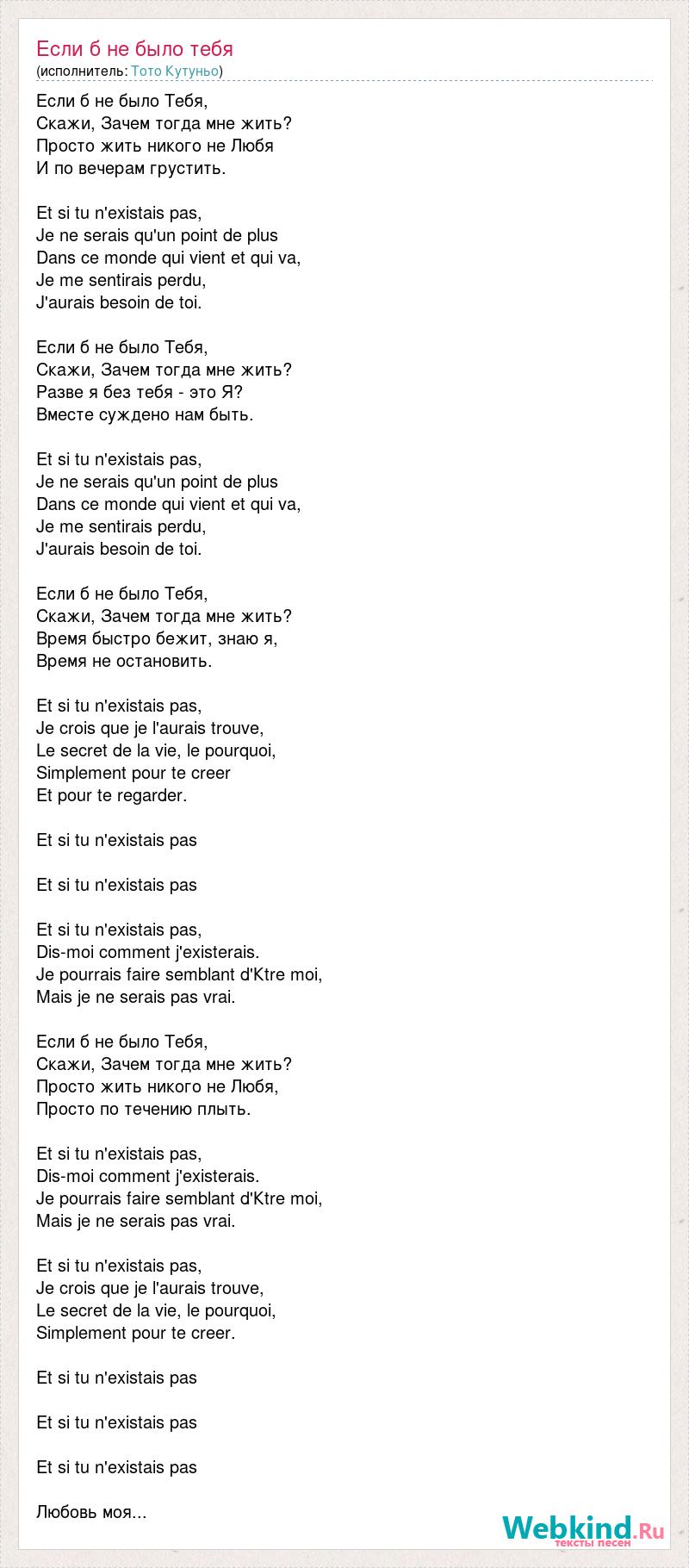 Если б не было Тебя, Скажи, Зачем тогда мне жить? Просто жить никого не Любя И по вечерам грустить. Et si tu n'existais pas, Je ne serais qu'un point de plus Dans ce monde qui vient et qui va, Je me sentirais perdu, J'aurais besoin de toi. Если б не было Тебя, Скажи, Зачем тогда мне жить? Разве я без тебя - это Я? Вместе суждено нам быть. Et si tu n'existais pas, Je ne serais qu'un point de plus Dans ce monde qui vient et qui va, Je me sentirais perdu, J'aurais besoin de toi. Если б не было Тебя, Скажи, Зачем тогда мне жить? Время быстро бежит, знаю я, Время не остановить. Et si tu n'existais pas, Je crois que je l'aurais trouve, Le secret de la vie, le pourquoi, Simplement pour te creer Et pour te regarder. Et si tu n'existais pas Et si tu n'existais pas Et si tu n'existais pas, Dis-moi comment j'existerais. Je pourrais faire semblant d'Кtre moi, Mais je ne serais pas vrai. Если б не было Тебя, Скажи, Зачем тогда мне жить? Просто жить никого не Любя, Просто по течению плыть. Et si tu n'existais pas, Dis-moi comment j'existerais. Je pourrais faire semblant d'Кtre moi, Mais je ne serais pas vrai. Et si tu n'existais pas, Je crois que je l'aurais trouve, Le secret de la vie, le pourquoi, Simplement pour te creer. Et si tu n'existais pas Et si tu n'existais pas Et si tu n'existais pas Любовь моя...