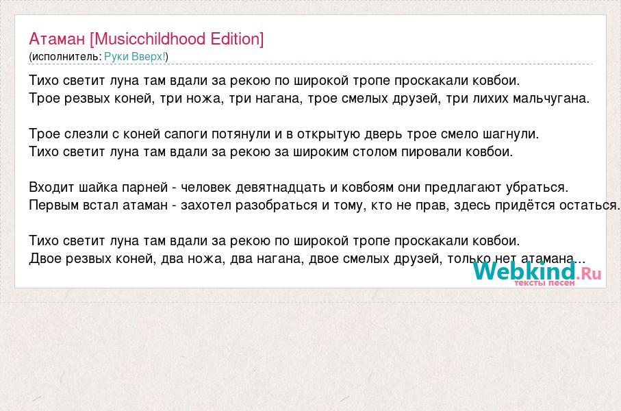 Тихо светит луна там вдали за рекою по широкой тропе проскакали ковбои. Трое резвых коней, три ножа, три нагана, трое смелых друзей, три лихих мальчугана. Трое слезли с коней сапоги потянули и в открытую дверь трое смело шагнули. Тихо светит луна там вдали за рекою за широким столом пировали ковбои. Входит шайка парней - человек девятнадцать и ковбоям они предлагают убраться. Первым встал атаман - захотел разобраться и тому, кто не прав, здесь придётся остаться. Тихо светит луна там вдали за рекою по широкой тропе проскакали ковбои. Двое резвых коней, два ножа, два нагана, двое смелых друзей, только нет атамана...