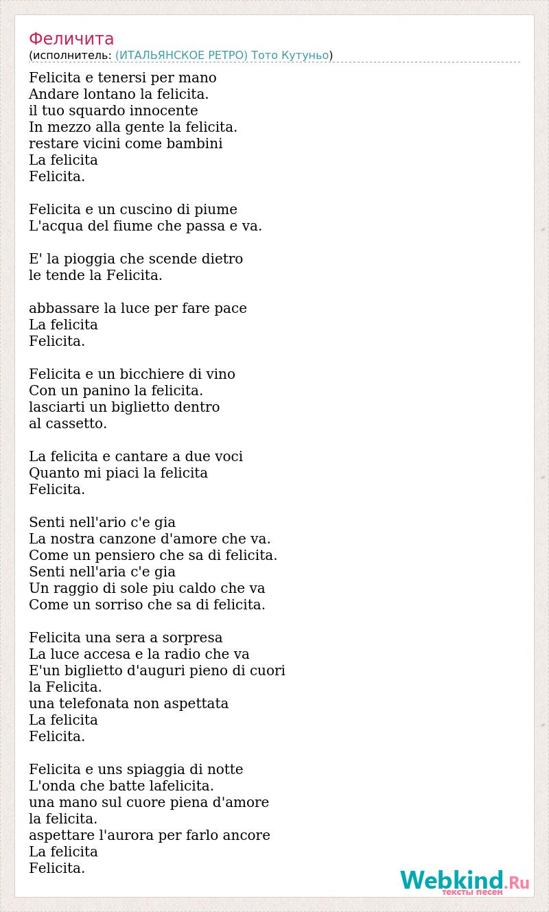 Felicita e tenersi per mano Andare lontano la felicita. il tuo squardo innocente In mezzo alla gente la felicita. restare vicini come bambini La felicita Felicita. Felicita e un cuscino di piume L'acqua del fiume che passa e va. E' la pioggia che scende dietro le tende la Felicita. abbassare la luce per fare pace La felicita Felicita. Felicita e un bicchiere di vino Con un panino la felicita. lasciarti un biglietto dentro al cassetto. La felicita e cantare a due voci Quanto mi piaci la felicita Felicita. Senti nell'ario c'e gia La nostra canzone d'amore che va. Come un pensiero che sa di felicita. Senti nell'aria c'e gia Un raggio di sole piu caldo che va Come un sorriso che sa di felicita. Felicita una sera a sorpresa La luce accesa e la radio che va E'un biglietto d'auguri pieno di cuori la Felicita. una telefonata non aspettata La felicita Felicita. Felicita e uns spiaggia di notte L'onda che batte lafelicita. una mano sul cuore piena d'amore la felicita. aspettare l'aurora per farlo ancore La felicita Felicita.