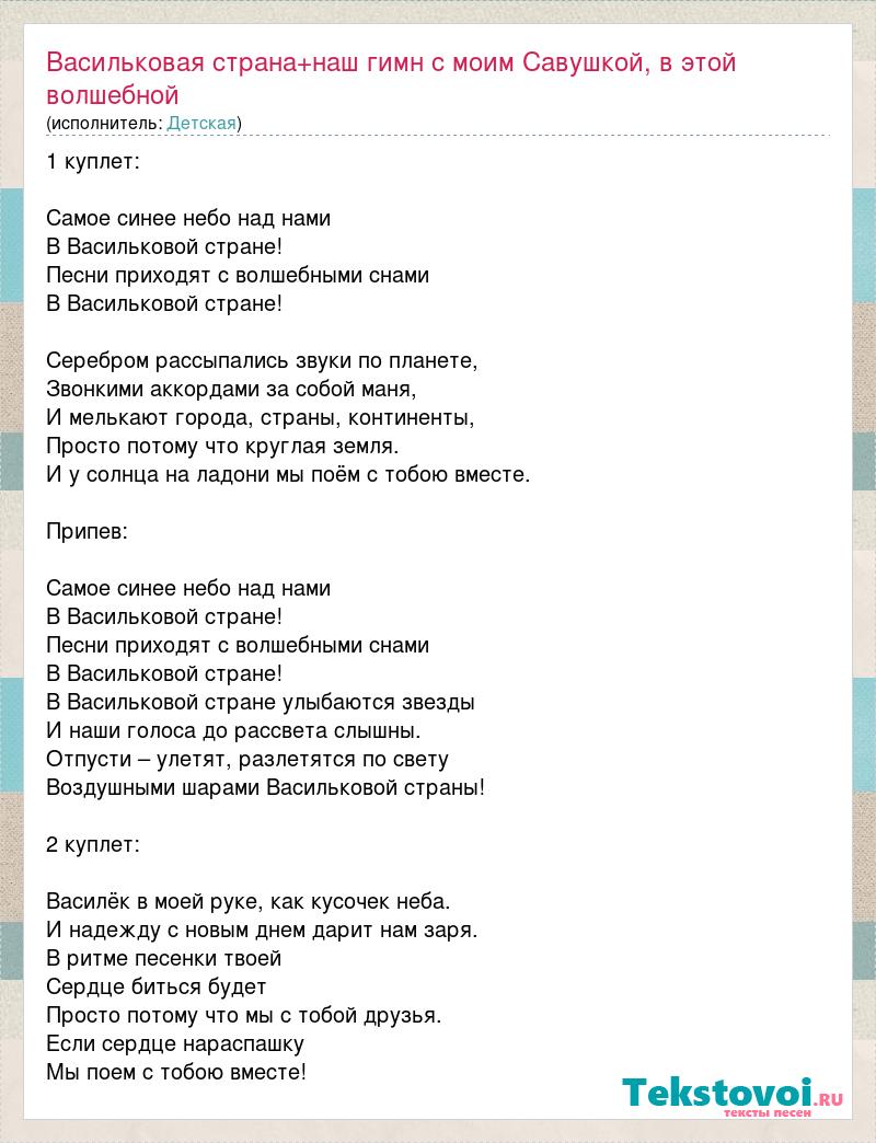 1 куплет: Самое синее небо над нами В Васильковой стране! Песни приходят с волшебными снами В Васильковой стране! Серебром рассыпались звуки по планете, Звонкими аккордами за собой маня, И мелькают города, страны, континенты, Просто потому что круглая земля. И у солнца на ладони мы поём с тобою вместе. Припев: Самое синее небо над нами В Васильковой стране! Песни приходят с волшебными снами В Васильковой стране! В Васильковой стране улыбаются звезды И наши голоса до рассвета слышны. Отпусти – улетят, разлетятся по свету Воздушными шарами Васильковой страны! 2 куплет: Василёк в моей руке, как кусочек неба. И надежду с новым днем дарит нам заря. В ритме песенки твоей Сердце биться будет Просто потому что мы с тобой друзья. Если сердце нараспашку Мы поем с тобою вместе!