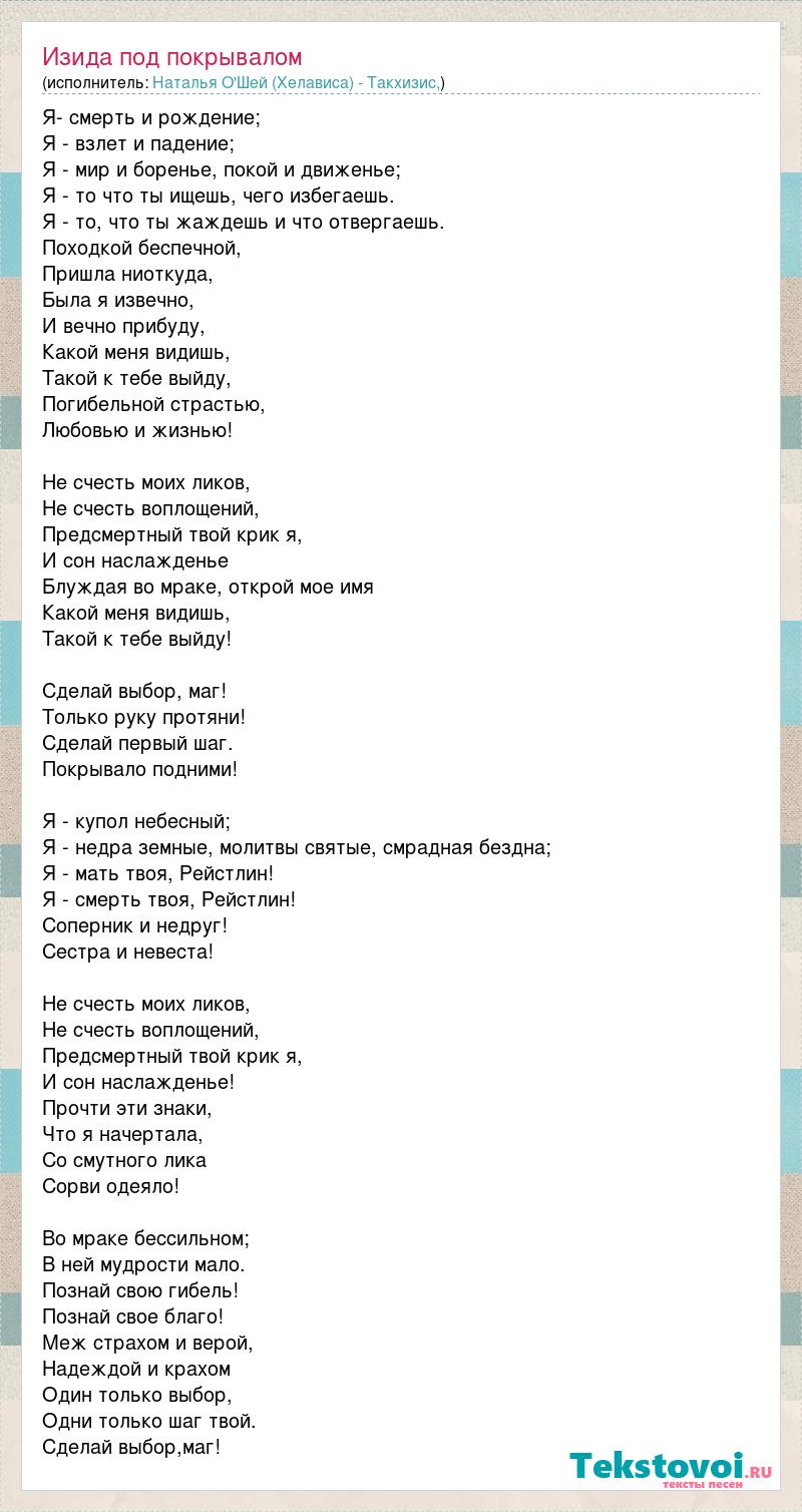 Я- смерть и рождение; Я - взлет и падение; Я - мир и боренье, покой и движенье; Я - то что ты ищешь, чего избегаешь. Я - то, что ты жаждешь и что отвергаешь. Походкой беспечной, Пришла ниоткуда, Была я извечно, И вечно прибуду, Какой меня видишь, Такой к тебе выйду, Погибельной страстью, Любовью и жизнью! Не счесть моих ликов, Не счесть воплощений, Предсмертный твой крик я, И сон наслажденье Блуждая во мраке, открой мое имя Какой меня видишь, Такой к тебе выйду! Сделай выбор, маг! Только руку протяни! Сделай первый шаг. Покрывало подними! Я - купол небесный; Я - недра земные, молитвы святые, смрадная бездна; Я - мать твоя, Рейстлин! Я - смерть твоя, Рейстлин! Соперник и недруг! Сестра и невеста! Не счесть моих ликов, Не счесть воплощений, Предсмертный твой крик я, И сон наслажденье! Прочти эти знаки, Что я начертала, Со смутного лика Сорви одеяло! Во мраке бессильном; В ней мудрости мало. Познай свою гибель! Познай свое благо! Меж страхом и верой, Надеждой и крахом Один только выбор, Одни только шаг твой. Сделай выбор,маг!