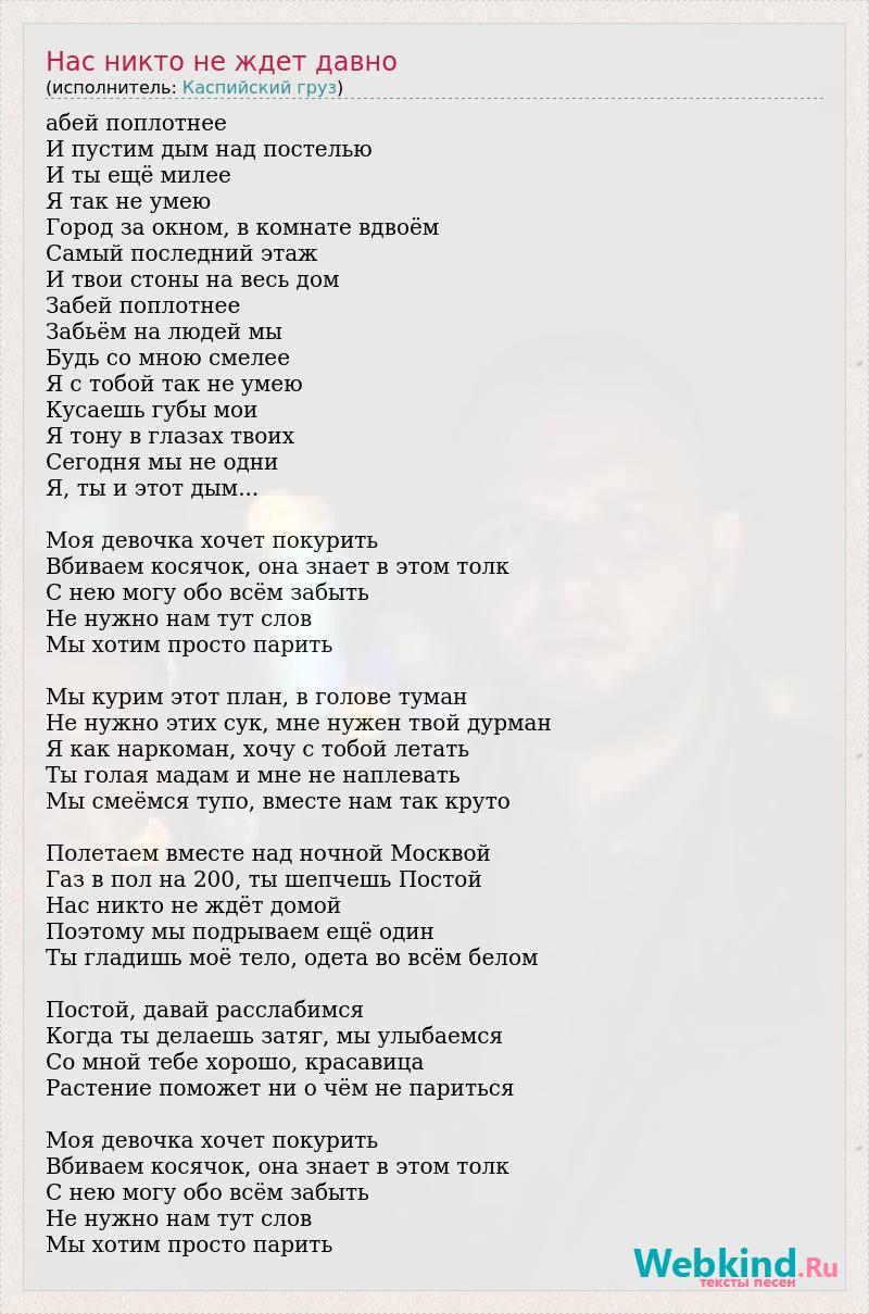 абей поплотнее И пустим дым над постелью И ты ещё милее Я так не умею Город за окном, в комнате вдвоём Самый последний этаж И твои стоны на весь дом Забей поплотнее Забьём на людей мы Будь со мною смелее Я с тобой так не умею Кусаешь губы мои Я тону в глазах твоих Сегодня мы не одни Я, ты и этот дым... Моя девочка хочет покурить Вбиваем косячок, она знает в этом толк С нею могу обо всём забыть Не нужно нам тут слов Мы хотим просто парить Мы курим этот план, в голове туман Не нужно этих сук, мне нужен твой дурман Я как наркоман, хочу с тобой летать Ты голая мадам и мне не наплевать Мы смеёмся тупо, вместе нам так круто Полетаем вместе над ночной Москвой Газ в пол на 200, ты шепчешь Постой Нас никто не ждёт домой Поэтому мы подрываем ещё один Ты гладишь моё тело, одета во всём белом Постой, давай расслабимся Когда ты делаешь затяг, мы улыбаемся Со мной тебе хорошо, красавица Растение поможет ни о чём не париться Моя девочка хочет покурить Вбиваем косячок, она знает в этом толк С нею могу обо всём забыть Не нужно нам тут слов Мы хотим просто парить