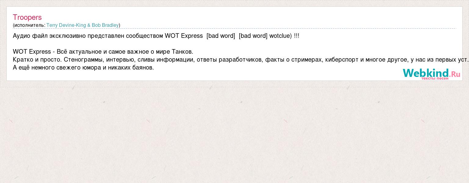 Аудио файл эксклюзивно представлен сообществом WOT Express [bad word] [bad word] wotclue) !!! WOT Express - Всё актуальное и самое важное о мире Танков. Кратко и просто. Стенограммы, интервью, сливы информации, ответы разработчиков, факты о стримерах, киберспорт и многое другое, у нас из первых уст. А ещё немного свежего юмора и никаких баянов.