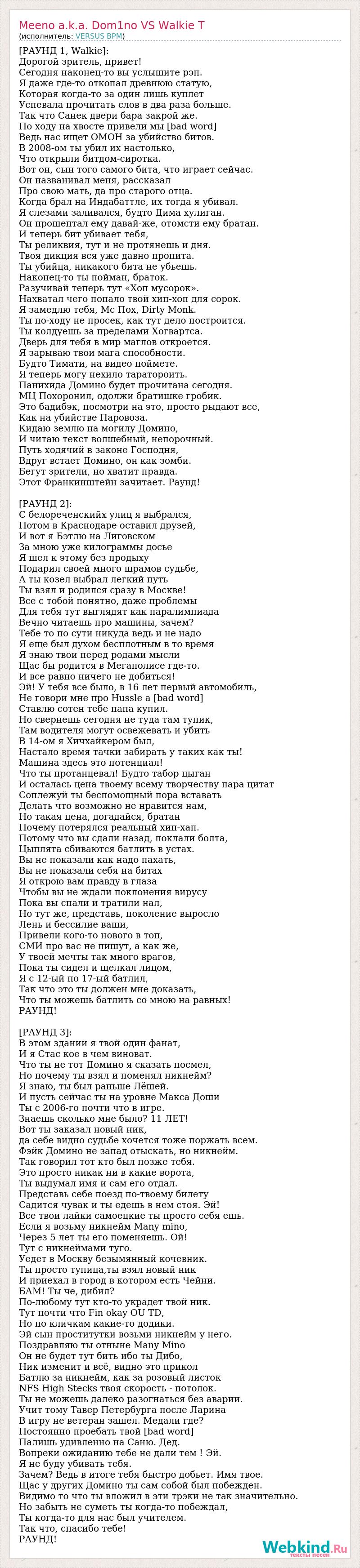 [РАУНД 1, Walkie]: Дорогой зритель, привет! Сегодня наконец-то вы услышите рэп. Я даже где-то откопал древнюю статую, Которая когда-то за один лишь куплет Успевала прочитать слов в два раза больше. Так что Санек двери бара закрой же. По ходу на хвосте привели мы [bad word] Ведь нас ищет ОМОН за убийство битов. В 2008-ом ты убил их настолько, Что открыли битдом-сиротка. Вот он, сын того самого бита, что играет сейчас. Он названивал меня, рассказал Про свою мать, да про старого отца. Когда брал на Индабаттле, их тогда я убивал. Я слезами заливался, будто Дима хулиган. Он прошептал ему давай-же, отомсти ему братан. И теперь бит убивает тебя, Ты реликвия, тут и не протянешь и дня. Твоя дикция вся уже давно пропита. Ты убийца, никакого бита не убьешь. Наконец-то ты пойман, браток. Разучивай теперь тут «Хоп мусорок». Нахватал чего попало твой хип-хоп для сорок. Я замедлю тебя, Mc Пох, Dirty Monk. Ты по-ходу не просек, как тут дело построится. Ты колдуешь за пределами Хогвартса. Дверь для тебя в мир маглов откроется. Я зарываю твои мага способности. Будто Тимати, на видео поймете. Я теперь могу нехило таратороить. Панихида Домино будет прочитана сегодня. МЦ Похоронил, одолжи братишке гробик. Это бадибэк, посмотри на это, просто рыдают все, Как на убийстве Паровоза. Кидаю землю на могилу Домино, И читаю текст волшебный, непорочный. Путь ходячий в законе Господня, Вдруг встает Домино, он как зомби. Бегут зрители, но хватит правда. Этот Франкинштейн зачитает. Раунд! [РАУНД 2]: С белореченскийх улиц я выбрался, Потом в Краснодаре оставил друзей, И вот я Бэтлю на Лиговском За мною уже килограммы досье Я шел к этому без продыху Подарил своей много шрамов судьбе, А ты козел выбрал легкий путь Ты взял и родился сразу в Москве! Все с тобой понятно, даже проблемы Для тебя тут выглядят как паралимпиада Вечно читаешь про машины, зачем? Тебе то по сути никуда ведь и не надо Я еще был духом бесплотным в то время Я знаю твои перед родами мысли Щас бы родится в Мегаполисе где-то. И все равно ничего не добиться! Эй! У тебя все было, в 16 лет первый автомобиль, Не говори мне про Hussle a [bad word] Ставлю сотен тебе папа купил. Но свернешь сегодня не туда там тупик, Там водителя могут освежевать и убить В 14-ом я Хичхайкером был, Настало время тачки забирать у таких как ты! Машина здесь это потенциал! Что ты протанцевал! Будто табор цыган И осталась цена твоему всему творчеству пара цитат Соплежуй ты беспомощный пора вставать Делать что возможно не нравится нам, Но такая цена, догадайся, братан Почему потерялся реальный хип-хап. Потому что вы сдали назад, поклали болта, Цыплята сбиваются батлить в устах. Вы не показали как надо пахать, Вы не показали себя на битах Я открою вам правду в глаза Чтобы вы не ждали поклонения вирусу Пока вы спали и тратили нал, Но тут же, представь, поколение выросло Лень и бессилие ваши, Привели кого-то нового в топ, СМИ про вас не пишут, а как же, У твоей мечты так много врагов, Пока ты сидел и щелкал лицом, Я с 12-ый по 17-ый батлил, Так что это ты должен мне доказать, Что ты можешь батлить со мною на равных! РАУНД! [РАУНД 3]: В этом здании я твой один фанат, И я Стас кое в чем виноват. Что ты не тот Домино я сказать посмел, Но почему ты взял и поменял никнейм? Я знаю, ты был раньше Лёшей. И пусть сейчас ты на уровне Макса Доши Ты с 2006-го почти что в игре. Знаешь сколько мне было? 11 ЛЕТ! Вот ты заказал новый ник, да себе 