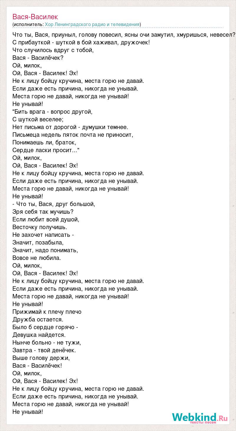 Что ты, Вася, приуныл, голову повесил, ясны очи замутил, хмуришься, невесел? С прибауткой - шуткой в бой хаживал, дружочек! Что случилось вдруг с тобой, Вася - Василёчек? Ой, милок, Ой, Вася - Василек! Эх! Не к лицу бойцу кручина, места горю не давай. Если даже есть причина, никогда не унывай. Места горю не давай, никогда не унывай! Не унывай! "Бить врага - вопрос другой, С шуткой веселее; Нет письма от дорогой - думушки темнее. Письмеца недель пяток почта не приносит, Понимаешь ли, браток, Сердце ласки просит..." Ой, милок, Ой, Вася - Василек! Эх! Не к лицу бойцу кручина, места горю не давай. Если даже есть причина, никогда не унывай. Места горю не давай, никогда не унывай! Не унывай! - Что ты, Вася, друг большой, Зря себя так мучишь? Если любит всей душой, Весточку получишь. Не захочет написать - Значит, позабыла, Значит, надо понимать, Вовсе не любила. Ой, милок, Ой, Вася - Василек! Эх! Не к лицу бойцу кручина, места горю не давай. Если даже есть причина, никогда не унывай. Места горю не давай, никогда не унывай! Не унывай! Прижимай к плечу плечо Дружба остается. Было б сердце горячо - Девушка найдется. Нынче больно - не тужи, Завтра - твой денёчек. Выше голову держи, Вася - Василёчек! Ой, милок, Ой, Вася - Василек! Эх! Не к лицу бойцу кручина, места горю не давай. Если даже есть причина, никогда не унывай. Места горю не давай, никогда не унывай! Не унывай!