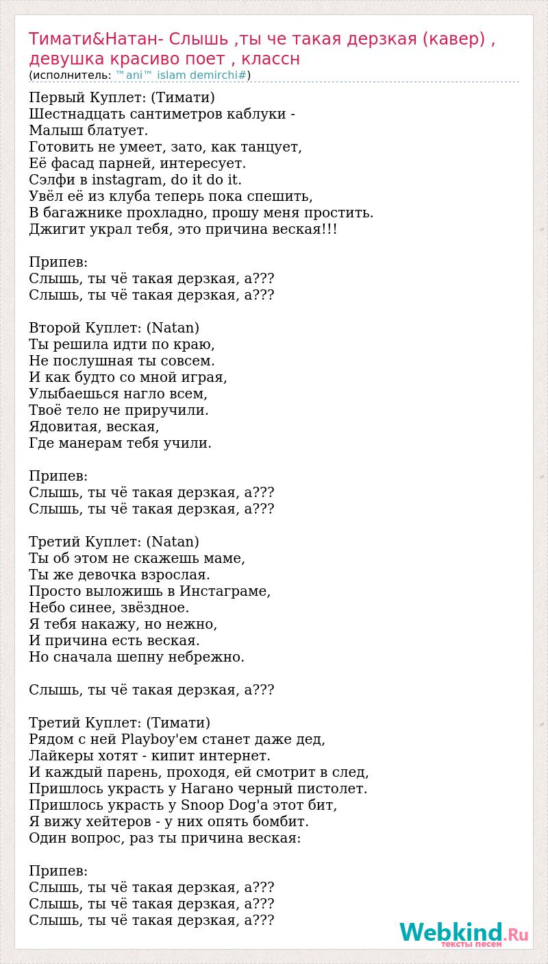 Первый Куплет: (Тимати) Шестнадцать сантиметров каблуки - Малыш блатует. Готовить не умеет, зато, как танцует, Её фасад парней, интересует. Сэлфи в instagram, do it do it. Увёл её из клуба теперь пока спешить, В багажнике прохладно, прошу меня простить. Джигит украл тебя, это причина веская!!! Припев: Слышь, ты чё такая дерзкая, а??? Слышь, ты чё такая дерзкая, а??? Второй Куплет: (Natan) Ты решила идти по краю, Не послушная ты совсем. И как будто со мной играя, Улыбаешься нагло всем, Твоё тело не приручили. Ядовитая, веская, Где манерам тебя учили. Припев: Слышь, ты чё такая дерзкая, а??? Слышь, ты чё такая дерзкая, а??? Третий Куплет: (Natan) Ты об этом не скажешь маме, Ты же девочка взрослая. Просто выложишь в Инстаграме, Небо синее, звёздное. Я тебя накажу, но нежно, И причина есть веская. Но сначала шепну небрежно. Слышь, ты чё такая дерзкая, а??? Третий Куплет: (Тимати) Рядом с ней Playboy'ем станет даже дед, Лайкеры хотят - кипит интернет. И каждый парень, проходя, ей смотрит в след, Пришлось украсть у Нагано черный пистолет. Пришлось украсть у Snoop Dog'а этот бит, Я вижу хейтеров - у них опять бомбит. Один вопрос, раз ты причина веская: Припев: Слышь, ты чё такая дерзкая, а??? Слышь, ты чё такая дерзкая, а??? Слышь, ты чё такая дерзкая, а???