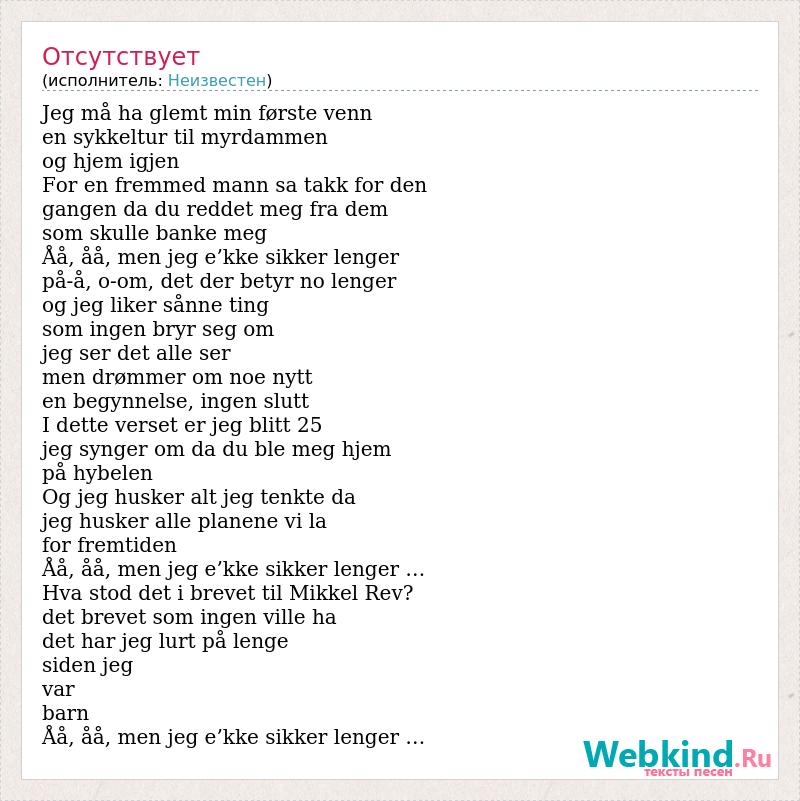 Jeg må ha glemt min første venn en sykkeltur til myrdammen og hjem igjen For en fremmed mann sa takk for den gangen da du reddet meg fra dem som skulle banke meg Åå, åå, men jeg e’kke sikker lenger på-å, o-om, det der betyr no lenger og jeg liker sånne ting som ingen bryr seg om jeg ser det alle ser men drømmer om noe nytt en begynnelse, ingen slutt I dette verset er jeg blitt 25 jeg synger om da du ble meg hjem på hybelen Og jeg husker alt jeg tenkte da jeg husker alle planene vi la for fremtiden Åå, åå, men jeg e’kke sikker lenger … Hva stod det i brevet til Mikkel Rev? det brevet som ingen ville ha det har jeg lurt på lenge siden jeg var barn Åå, åå, men jeg e’kke sikker lenger …