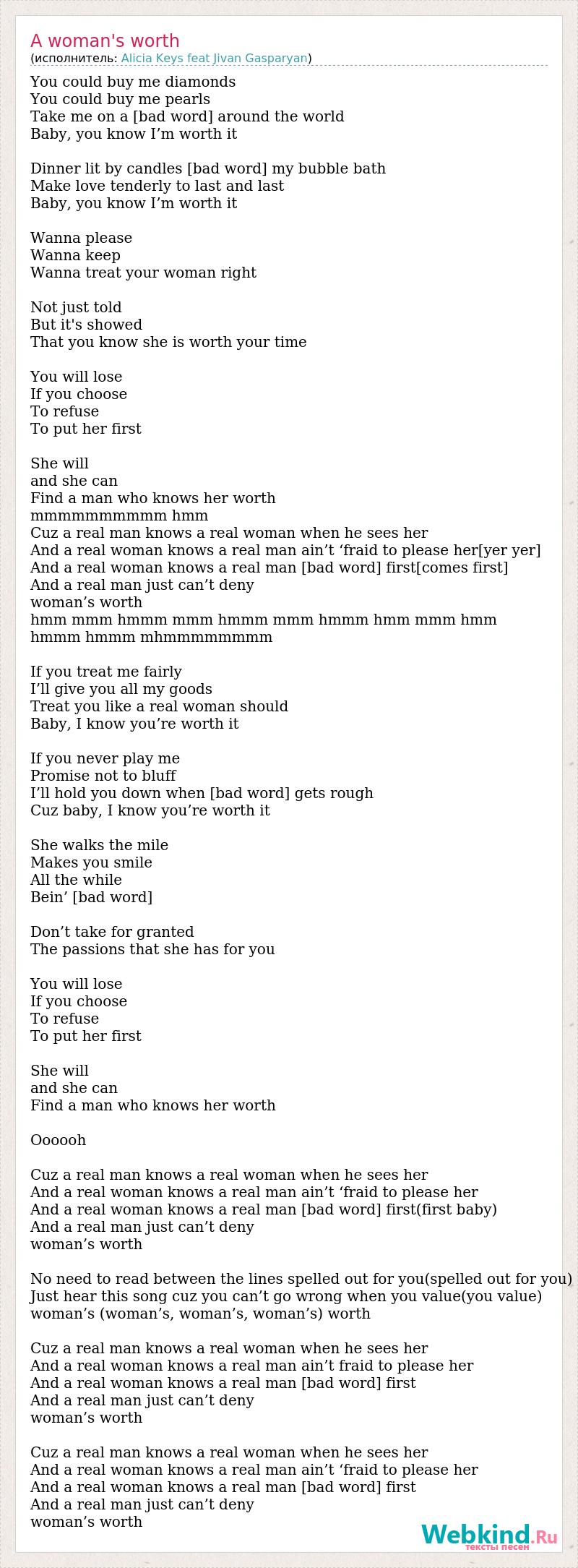 You could buy me diamonds You could buy me pearls Take me on a [bad word] around the world Baby, you know I’m worth it Dinner lit by candles [bad word] my bubble bath Make love tenderly to last and last Baby, you know I’m worth it Wanna please Wanna keep Wanna treat your woman right Not just told But it's showed That you know she is worth your time You will lose If you choose To refuse To put her first She will and she can Find a man who knows her worth mmmmmmmmmm hmm Cuz a real man knows a real woman when he sees her And a real woman knows a real man ain’t ‘fraid to please her[yer yer] And a real woman knows a real man [bad word] first[comes first] And a real man just can’t deny woman’s worth hmm mmm hmmm mmm hmmm mmm hmmm hmm mmm hmm hmmm hmmm mhmmmmmmmm If you treat me fairly I’ll give you all my goods Treat you like a real woman should Baby, I know you’re worth it If you never play me Promise not to bluff I’ll hold you down when [bad word] gets rough Cuz baby, I know you’re worth it She walks the mile Makes you smile All the while Bein’ [bad word] Don’t take for granted The passions that she has for you You will lose If you choose To refuse To put her first She will and she can Find a man who knows her worth Oooooh Cuz a real man knows a real woman when he sees her And a real woman knows a real man ain’t ‘fraid to please her And a real woman knows a real man [bad word] first(first baby) And a real man just can’t deny woman’s worth No need to read between the lines spelled out for you(spelled out for you) Just hear this song cuz you can’t go wrong when you value(you value) woman’s (woman’s, woman’s, woman’s) worth Cuz a real man knows a real woman when he sees her And a real woman knows a real man ain’t fraid to please her And a real woman knows a real man [bad word] first And a real man just can’t deny woman’s worth Cuz a real man knows a real woman when he sees her And a real woman knows a real man ain’t ‘fraid to please her And a real woman knows a real man [bad word] first And a real man just can’t deny woman’s worth