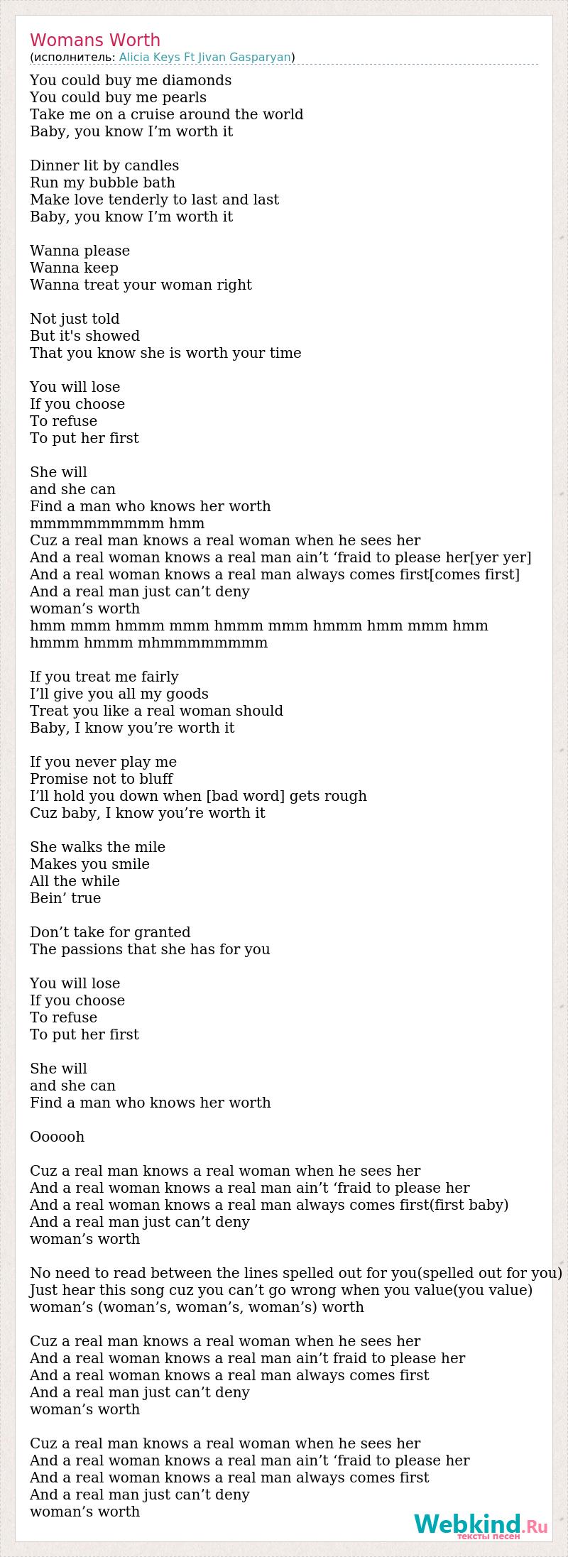 You could buy me diamonds You could buy me pearls Take me on a cruise around the world Baby, you know I’m worth it Dinner lit by candles Run my bubble bath Make love tenderly to last and last Baby, you know I’m worth it Wanna please Wanna keep Wanna treat your woman right Not just told But it's showed That you know she is worth your time You will lose If you choose To refuse To put her first She will and she can Find a man who knows her worth mmmmmmmmmm hmm Cuz a real man knows a real woman when he sees her And a real woman knows a real man ain’t ‘fraid to please her[yer yer] And a real woman knows a real man always comes first[comes first] And a real man just can’t deny woman’s worth hmm mmm hmmm mmm hmmm mmm hmmm hmm mmm hmm hmmm hmmm mhmmmmmmmm If you treat me fairly I’ll give you all my goods Treat you like a real woman should Baby, I know you’re worth it If you never play me Promise not to bluff I’ll hold you down when [bad word] gets rough Cuz baby, I know you’re worth it She walks the mile Makes you smile All the while Bein’ true Don’t take for granted The passions that she has for you You will lose If you choose To refuse To put her first She will and she can Find a man who knows her worth Oooooh Cuz a real man knows a real woman when he sees her And a real woman knows a real man ain’t ‘fraid to please her And a real woman knows a real man always comes first(first baby) And a real man just can’t deny woman’s worth No need to read between the lines spelled out for you(spelled out for you) Just hear this song cuz you can’t go wrong when you value(you value) woman’s (woman’s, woman’s, woman’s) worth Cuz a real man knows a real woman when he sees her And a real woman knows a real man ain’t fraid to please her And a real woman knows a real man always comes first And a real man just can’t deny woman’s worth Cuz a real man knows a real woman when he sees her And a real woman knows a real man ain’t ‘fraid to please her And a real woman knows a real man always comes first And a real man just can’t deny woman’s worth