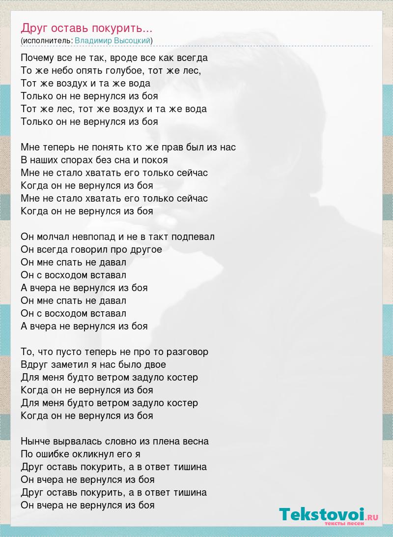 Почему все не так, вроде все как всегда То же небо опять голубое, тот же лес, Тот же воздух и та же вода Только он не вернулся из боя Тот же лес, тот же воздух и та же вода Только он не вернулся из боя Мне теперь не понять кто же прав был из нас В наших спорах без сна и покоя Мне не стало хватать его только сейчас Когда он не вернулся из боя Мне не стало хватать его только сейчас Когда он не вернулся из боя Он молчал невпопад и не в такт подпевал Он всегда говорил про другое Он мне спать не давал Он с восходом вставал А вчера не вернулся из боя Он мне спать не давал Он с восходом вставал А вчера не вернулся из боя То, что пусто теперь не про то разговор Вдруг заметил я нас было двое Для меня будто ветром задуло костер Когда он не вернулся из боя Для меня будто ветром задуло костер Когда он не вернулся из боя Нынче вырвалась словно из плена весна По ошибке окликнул его я Друг оставь покурить, а в ответ тишина Он вчера не вернулся из боя Друг оставь покурить, а в ответ тишина Он вчера не вернулся из боя