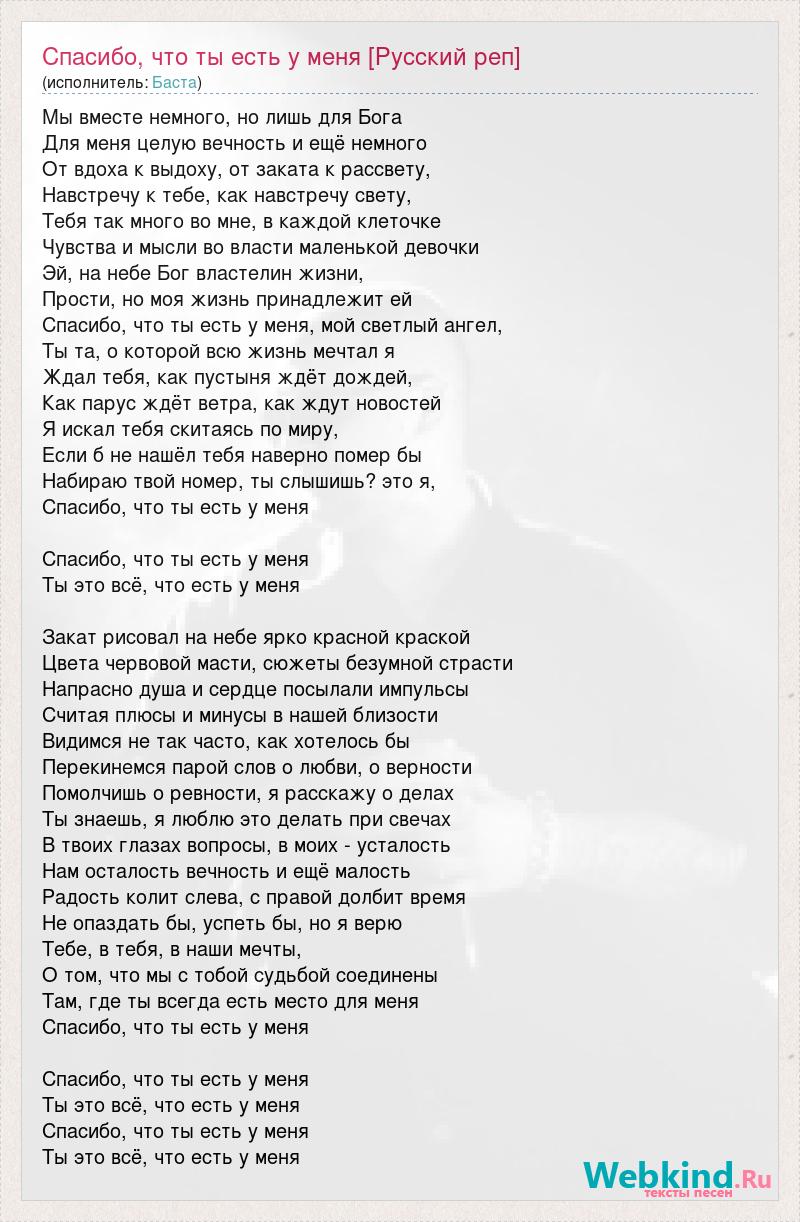 Мы вместе немного, но лишь для Бога Для меня целую вечность и ещё немного От вдоха к выдоху, от заката к рассвету, Навстречу к тебе, как навстречу свету, Тебя так много во мне, в каждой клеточке Чувства и мысли во власти маленькой девочки Эй, на небе Бог властелин жизни, Прости, но моя жизнь принадлежит ей Спасибо, что ты есть у меня, мой светлый ангел, Ты та, о которой всю жизнь мечтал я Ждал тебя, как пустыня ждёт дождей, Как парус ждёт ветра, как ждут новостей Я искал тебя скитаясь по миру, Если б не нашёл тебя наверно помер бы Набираю твой номер, ты слышишь? это я, Спасибо, что ты есть у меня Спасибо, что ты есть у меня Ты это всё, что есть у меня Закат рисовал на небе ярко красной краской Цвета червовой масти, сюжеты безумной страсти Напрасно душа и сердце посылали импульсы Считая плюсы и минусы в нашей близости Видимся не так часто, как хотелось бы Перекинемся парой слов о любви, о верности Помолчишь о ревности, я расскажу о делах Ты знаешь, я люблю это делать при свечах В твоих глазах вопросы, в моих - усталость Нам осталость вечность и ещё малость Радость колит слева, с правой долбит время Не опаздать бы, успеть бы, но я верю Тебе, в тебя, в наши мечты, О том, что мы с тобой судьбой соединены Там, где ты всегда есть место для меня Спасибо, что ты есть у меня Спасибо, что ты есть у меня Ты это всё, что есть у меня Спасибо, что ты есть у меня Ты это всё, что есть у меня