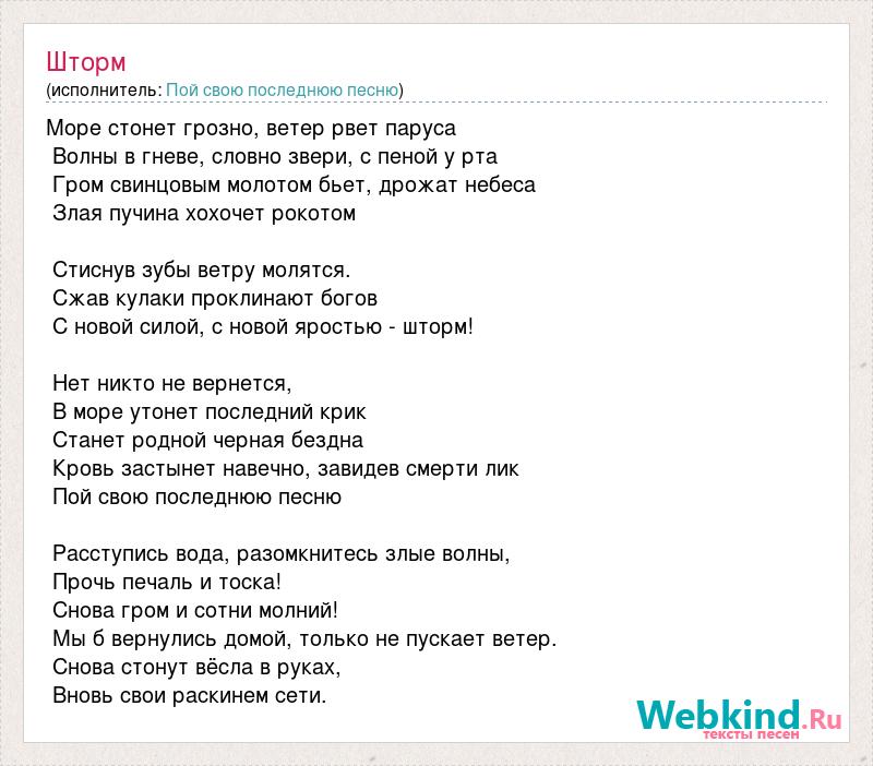 Море стонет грозно, ветер рвет паруса Волны в гневе, словно звери, с пеной у рта Гром свинцовым молотом бьет, дрожат небеса Злая пучина хохочет рокотом Стиснув зубы ветру молятся. Сжав кулаки проклинают богов С новой силой, с новой яростью - шторм! Нет никто не вернется, В море утонет последний крик Станет родной черная бездна Кровь застынет навечно, завидев смерти лик Пой свою последнюю песню Расступись вода, разомкнитесь злые волны, Прочь печаль и тоска! Снова гром и сотни молний! Мы б вернулись домой, только не пускает ветер. Снова стонут вёсла в руках, Вновь свои раскинем сети.
