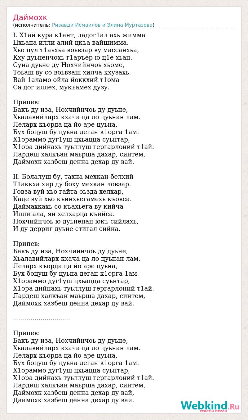 I. Х1ай кура к1ант, ладог1ал ахь жимма Цхьана илли алий цкъа вайшимма. Хьо цул т1аьхьа воьвзар ву массанхьа, Кху дуьненчохь г1аръер ю ц1е хьан. Суна дуьне ду Нохчийнчоь хьоме, Тоьаш ву со воьвзаш хилча кхузахь. Вай 1аламо ойла йоккхий т1ома Са дог иллех, мукъамех дузу. Припев: Бакъ ду иза, Нохчийнчоь ду дуьне, Хьалавийларх кхача ца ло цуьнан лам. Леларх къорда ца йо аре цуьна, Бух боцуш бу цуьна деган к1орга 1ам. Х1ораммо дуг1уш цхьацца суьнтар, Х1ора дийнахь туьллуш гергарлоний т1ай. Лардеш халкъан маьрша дахар, синтем, Даймохк хазбеш денна дехар ду вай. II. Болалуш бу, тахна мехкан белхий Т1аккха хир ду боху мехкан ловзар. Говза вуй хьо гайта оьзда хелхар, Каде вуй хьо къинхьегамехь къовса. Даймахкахь со къахьега ву кийча Илли ала, ян хелхарца къийса. Нохчийнчоь ю дуьненан юкъ сийлахь, И ду дерриг дуьне стигал сийна. Припев: Бакъ ду иза, Нохчийнчоь ду дуьне, Хьалавийларх кхача ца ло цуьнан лам. Леларх къорда ца йо аре цуьна, Бух боцуш бу цуьна деган к1орга 1ам. Х1ораммо дуг1уш цхьацца суьнтар, Х1ора дийнахь туьллуш гергарлоний т1ай. Лардеш халкъан маьрша дахар, синтем, Даймохк хазбеш денна дехар ду вай. ............................. Припев: Бакъ ду иза, Нохчийнчоь ду дуьне, Хьалавийларх кхача ца ло цуьнан лам. Леларх къорда ца йо аре цуьна, Бух боцуш бу цуьна деган к1орга 1ам. Х1ораммо дуг1уш цхьацца суьнтар, Х1ора дийнахь туьллуш гергарлоний т1ай. Лардеш халкъан маьрша дахар, синтем, Даймохк хазбеш денна дехар ду вай, Даймохк хазбеш денна дехар ду вай.