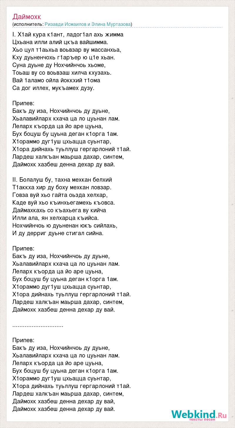 I. Х1ай кура к1ант, ладог1ал ахь жимма Цхьана илли алий цкъа вайшимма. Хьо цул т1аьхьа воьвзар ву массанхьа, Кху дуьненчохь г1аръер ю ц1е хьан. Суна дуьне ду Нохчийнчоь хьоме, Тоьаш ву со воьвзаш хилча кхузахь. Вай 1аламо ойла йоккхий т1ома Са дог иллех, мукъамех дузу. Припев: Бакъ ду иза, Нохчийнчоь ду дуьне, Хьалавийларх кхача ца ло цуьнан лам. Леларх къорда ца йо аре цуьна, Бух боцуш бу цуьна деган к1орга 1ам. Х1ораммо дуг1уш цхьацца суьнтар, Х1ора дийнахь туьллуш гергарлоний т1ай. Лардеш халкъан маьрша дахар, синтем, Даймохк хазбеш денна дехар ду вай. II. Болалуш бу, тахна мехкан белхий Т1аккха хир ду боху мехкан ловзар. Говза вуй хьо гайта оьзда хелхар, Каде вуй хьо къинхьегамехь къовса. Даймахкахь со къахьега ву кийча Илли ала, ян хелхарца къийса. Нохчийнчоь ю дуьненан юкъ сийлахь, И ду дерриг дуьне стигал сийна. Припев: Бакъ ду иза, Нохчийнчоь ду дуьне, Хьалавийларх кхача ца ло цуьнан лам. Леларх къорда ца йо аре цуьна, Бух боцуш бу цуьна деган к1орга 1ам. Х1ораммо дуг1уш цхьацца суьнтар, Х1ора дийнахь туьллуш гергарлоний т1ай. Лардеш халкъан маьрша дахар, синтем, Даймохк хазбеш денна дехар ду вай. ............................. Припев: Бакъ ду иза, Нохчийнчоь ду дуьне, Хьалавийларх кхача ца ло цуьнан лам. Леларх къорда ца йо аре цуьна, Бух боцуш бу цуьна деган к1орга 1ам. Х1ораммо дуг1уш цхьацца суьнтар, Х1ора дийнахь туьллуш гергарлоний т1ай. Лардеш халкъан маьрша дахар, синтем, Даймохк хазбеш денна дехар ду вай, Даймохк хазбеш денна дехар ду вай.
