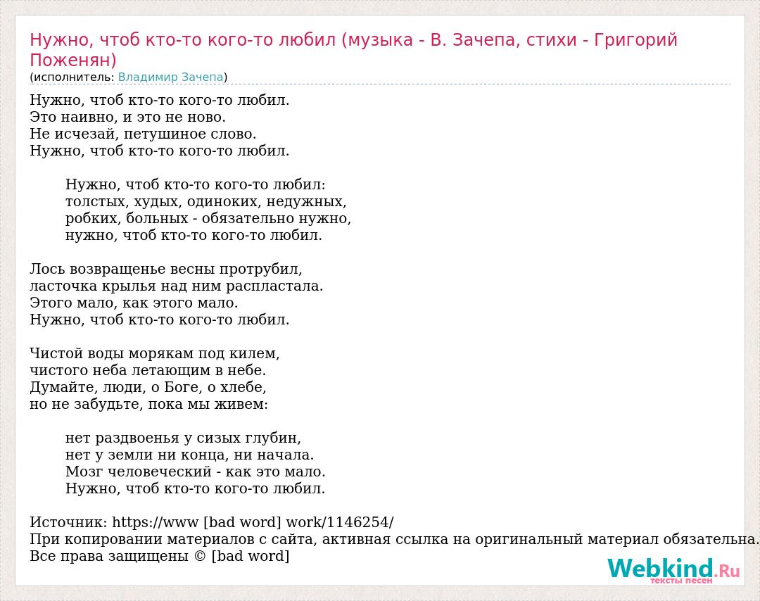 Главная→Исполнители→Владимир Зачепа→Нужно, чтоб кто-то кого-то любил (музыка - В. Зачепа, стихи - Григорий