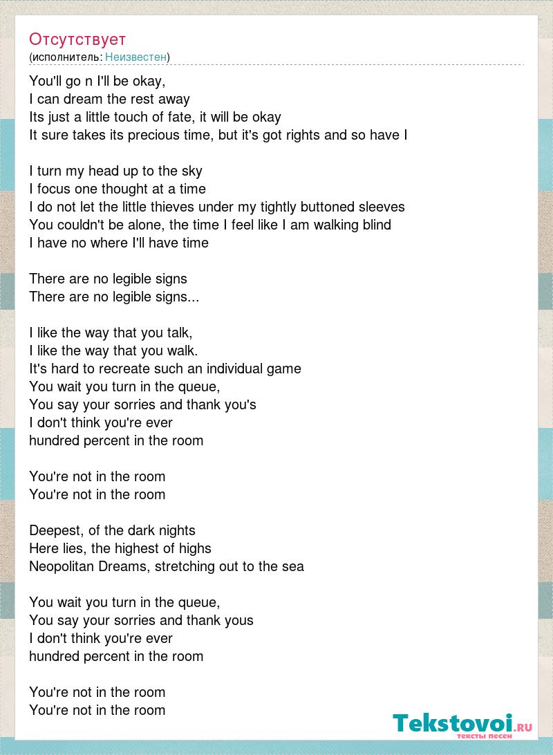 You'll go n I'll be okay, I can dream the rest away Its just a little touch of fate, it will be okay It sure takes its precious time, but it's got rights and so have I I turn my head up to the sky I focus one thought at a time I do not let the little thieves under my tightly buttoned sleeves You couldn't be alone, the time I feel like I am walking blind I have no where I'll have time There are no legible signs There are no legible signs... I like the way that you talk, I like the way that you walk. It's hard to recreate such an individual game You wait you turn in the queue, You say your sorries and thank you's I don't think you're ever hundred percent in the room You're not in the room You're not in the room Deepest, of the dark nights Here lies, the highest of highs Neopolitan Dreams, stretching out to the sea You wait you turn in the queue, You say your sorries and thank yous I don't think you're ever hundred percent in the room You're not in the room You're not in the room