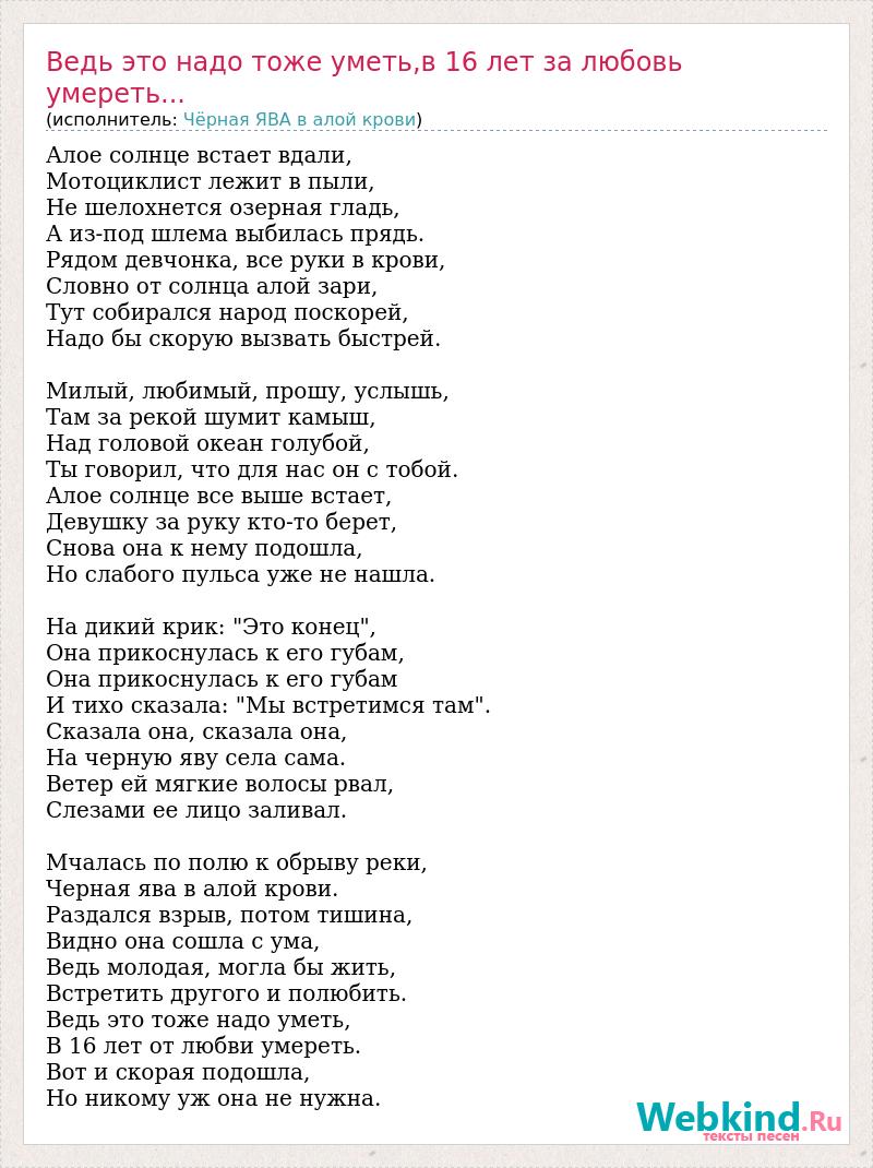 Алое солнце встает вдали, Мотоциклист лежит в пыли, Не шелохнется озерная гладь, А из-под шлема выбилась прядь. Рядом девчонка, все руки в крови, Словно от солнца алой зари, Тут собирался народ поскорей, Надо бы скорую вызвать быстрей. Милый, любимый, прошу, услышь, Там за рекой шумит камыш, Над головой океан голубой, Ты говорил, что для нас он с тобой. Алое солнце все выше встает, Девушку за руку кто-то берет, Снова она к нему подошла, Но слабого пульса уже не нашла. На дикий крик: "Это конец", Она прикоснулась к его губам, Она прикоснулась к его губам И тихо сказала: "Мы встретимся там". Сказала она, сказала она, На черную яву села сама. Ветер ей мягкие волосы рвал, Слезами ее лицо заливал. Мчалась по полю к обрыву реки, Черная ява в алой крови. Раздался взрыв, потом тишина, Видно она сошла с ума, Ведь молодая, могла бы жить, Встретить другого и полюбить. Ведь это тоже надо уметь, В 16 лет от любви умереть. Вот и скорая подошла, Но никому уж она не нужна.