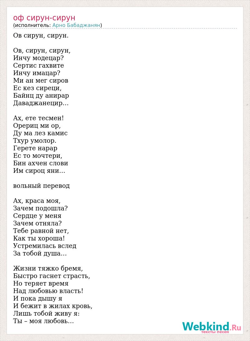 Ов сирун, сирун. Ов, сирун, сирун, Инчу модецар? Сертис гахвите Инчу имацар? Ми ан мег сиров Ес кез сиреци, Байнц ду анирар Даваджанецир… Ах, ете тесмен! Орериц ми ор, Ду ма лез камис Тхур умолор. Герете нарар Ес то мочтери, Бин ахчен слови Им сироц яни… вольный перевод Ах, краса моя, Зачем подошла? Сердце у меня Зачем отняла? Тебе равной нет, Как ты хороша! Устремилась вслед За тобой душа… Жизни тяжко бремя, Быстро гаснет страсть, Но теряет время Над любовью власть! И пока дышу я И бежит в жилах кровь, Лишь тобой живу я: Ты – моя любовь…