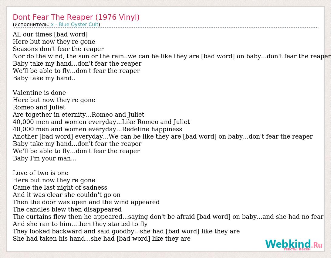 All our times [bad word] Here but now they're gone Seasons don't fear the reaper Nor do the wind, the sun or the rain..we can be like they are [bad word] on baby...don't fear the reaper Baby take my hand...don't fear the reaper We'll be able to fly...don't fear the reaper Baby take my hand.. Valentine is done Here but now they're gone Romeo and Juliet Are together in eternity...Romeo and Juliet 40,000 men and women everyday...Like Romeo and Juliet 40,000 men and women everyday...Redefine happiness Another [bad word] everyday...We can be like they are [bad word] on baby...don't fear the reaper Baby take my hand...don't fear the reaper We'll be able to fly...don't fear the reaper Baby I'm your man... Love of two is one Here but now they're gone Came the last night of sadness And it was clear she couldn't go on Then the door was open and the wind appeared The candles blew then disappeared The curtains flew then he appeared...saying don't be afraid [bad word] on baby...and she had no fear And she ran to him...then they started to fly They looked backward and said goodby...she had [bad word] like they are She had taken his hand...she had [bad word] like they are