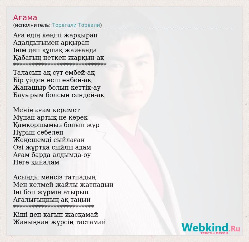 Аға едің көңілі жарқырап Адалдығымен арқырап Інім деп құшақ жайғанда Қабағың неткен жарқын-ақ ****************************** Таласып ақ сүт ембей-ақ Бір үйден өсіп өнбей-ақ Жанашыр болып кеттік-ау Бауырым болсын сендей-ақ Менің ағам керемет Мұнан артық не керек Қамқоршымыз болып жүр Нұрын себелеп Жеңешемді сыйлаған Өзі жұртқа сыйлы адам Ағам барда алдымда-оу Неге қиналам Асыңды менсіз татпадың Мен келмей жайлы жатпадың Іні боп жүрмін атырып Ағалығыңның ақ таңын ************************** Кіші деп қағып жасқамай Жаныңнан жүрсің тастамай