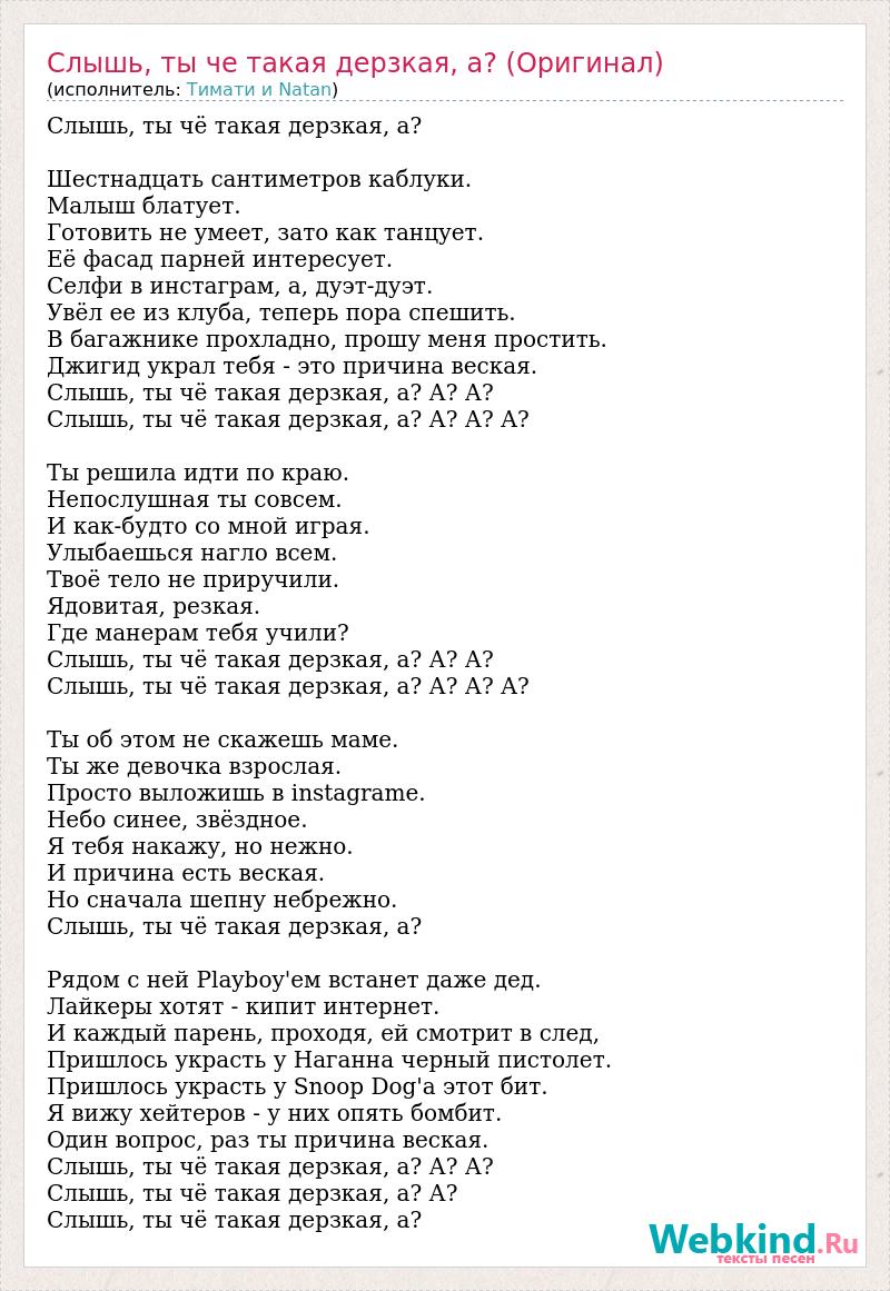 Слышь, ты чё такая дерзкая, а? Шестнадцать сантиметров каблуки. Малыш блатует. Готовить не умеет, зато как танцует. Её фасад парней интересует. Селфи в инстаграм, а, дуэт-дуэт. Увёл ее из клуба, теперь пора спешить. В багажнике прохладно, прошу меня простить. Джигид украл тебя - это причина веская. Слышь, ты чё такая дерзкая, а? А? А? Слышь, ты чё такая дерзкая, а? А? А? А? Ты решила идти по краю. Непослушная ты совсем. И как-будто со мной играя. Улыбаешься нагло всем. Твоё тело не приручили. Ядовитая, резкая. Где манерам тебя учили? Слышь, ты чё такая дерзкая, а? А? А? Слышь, ты чё такая дерзкая, а? А? А? А? Ты об этом не скажешь маме. Ты же девочка взрослая. Просто выложишь в instagramе. Небо синее, звёздное. Я тебя накажу, но нежно. И причина есть веская. Но сначала шепну небрежно. Слышь, ты чё такая дерзкая, а? Рядом с ней Plаyboy'ем встанет даже дед. Лайкеры хотят - кипит интернет. И каждый парень, проходя, ей смотрит в след, Пришлось украсть у Наганна черный пистолет. Пришлось украсть у Snoop Dog'а этот бит. Я вижу хейтеров - у них опять бомбит. Один вопрос, раз ты причина веская. Слышь, ты чё такая дерзкая, а? А? А? Слышь, ты чё такая дерзкая, а? А? Слышь, ты чё такая дерзкая, а?