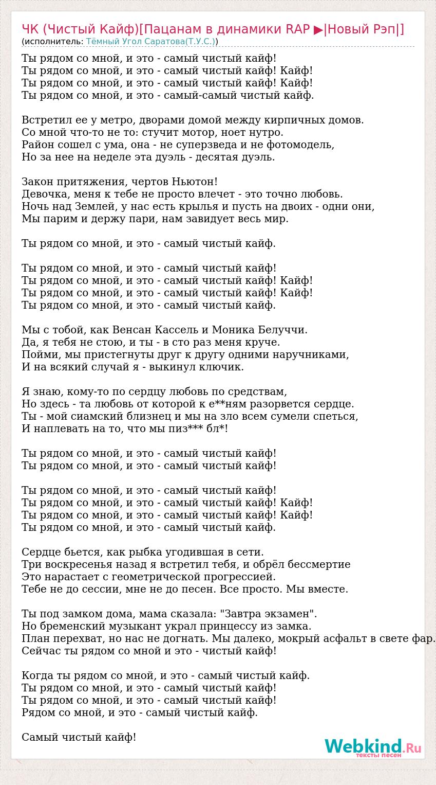 Ты рядом со мной, и это - самый чистый кайф! Ты рядом со мной, и это - самый чистый кайф! Кайф! Ты рядом со мной, и это - самый чистый кайф! Кайф! Ты рядом со мной, и это - самый-самый чистый кайф. Встретил ее у метро, дворами домой между кирпичных домов. Со мной что-то не то: стучит мотор, ноет нутро. Район сошел с ума, она - не суперзведа и не фотомодель, Но за нее на неделе эта дуэль - десятая дуэль. Закон притяжения, чертов Ньютон! Девочка, меня к тебе не просто влечет - это точно любовь. Ночь над Землей, у нас есть крылья и пусть на двоих - одни они, Мы парим и держу пари, нам завидует весь мир. Ты рядом со мной, и это - самый чистый кайф. Ты рядом со мной, и это - самый чистый кайф! Ты рядом со мной, и это - самый чистый кайф! Кайф! Ты рядом со мной, и это - самый чистый кайф! Кайф! Ты рядом со мной, и это - самый чистый кайф. Мы с тобой, как Венсан Кассель и Моника Белуччи. Да, я тебя не стою, и ты - в сто раз меня круче. Пойми, мы пристегнуты друг к другу одними наручниками, И на всякий случай я - выкинул ключик. Я знаю, кому-то по сердцу любовь по средствам, Но здесь - та любовь от которой к е**ням разорвется сердце. Ты - мой сиамский близнец и мы на зло всем сумели спеться, И наплевать на то, что мы пиз*** бл*! Ты рядом со мной, и это - самый чистый кайф! Ты рядом со мной, и это - самый чистый кайф! Ты рядом со мной, и это - самый чистый кайф! Ты рядом со мной, и это - самый чистый кайф! Кайф! Ты рядом со мной, и это - самый чистый кайф! Кайф! Ты рядом со мной, и это - самый чистый кайф. Сердце бьется, как рыбка угодившая в сети. Три воскресенья назад я встретил тебя, и обрёл бессмертие Это нарастает с геометрической прогрессией. Тебе не до сессии, мне не до песен. Все просто. Мы вместе. Ты под замком дома, мама сказала: "Завтра экзамен". Но бременский музыкант украл принцессу из замка. План перехват, но нас не догнать. Мы далеко, мокрый асфальт в свете фар. Сейчас ты рядом со мной и это - чистый кайф! Когда ты рядом со мной, и это - самый чистый кайф. Ты рядом со мной, и это - самый чистый кайф! Ты рядом со мной, и это - самый чистый кайф! Рядом со мной, и это - самый чистый кайф. Самый чистый кайф!