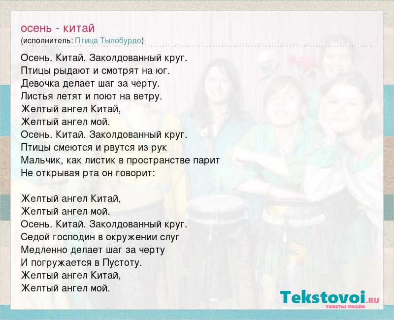 Осень. Китай. Заколдованный круг. Птицы рыдают и смотрят на юг. Девочка делает шаг за черту. Листья летят и поют на ветру. Желтый ангел Китай, Желтый ангел мой. Осень. Китай. Заколдованный круг. Птицы смеются и рвутся из рук Мальчик, как листик в пространстве парит Не открывая рта он говорит: Желтый ангел Китай, Желтый ангел мой. Осень. Китай. Заколдованный круг. Седой господин в окружении слуг Медленно делает шаг за черту И погружается в Пустоту. Желтый ангел Китай, Желтый ангел мой.
