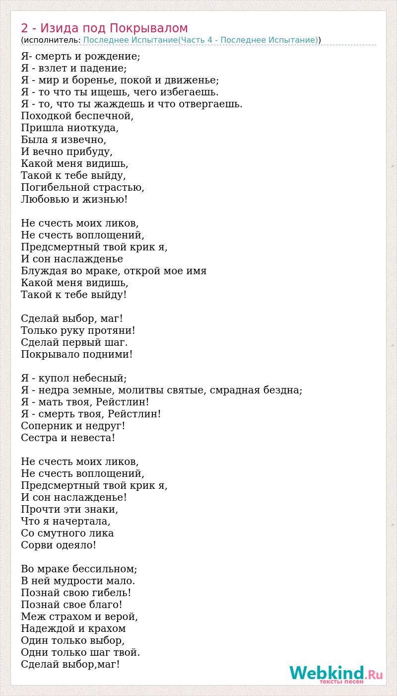 Я- смерть и рождение; Я - взлет и падение; Я - мир и боренье, покой и движенье; Я - то что ты ищешь, чего избегаешь. Я - то, что ты жаждешь и что отвергаешь. Походкой беспечной, Пришла ниоткуда, Была я извечно, И вечно прибуду, Какой меня видишь, Такой к тебе выйду, Погибельной страстью, Любовью и жизнью! Не счесть моих ликов, Не счесть воплощений, Предсмертный твой крик я, И сон наслажденье Блуждая во мраке, открой мое имя Какой меня видишь, Такой к тебе выйду! Сделай выбор, маг! Только руку протяни! Сделай первый шаг. Покрывало подними! Я - купол небесный; Я - недра земные, молитвы святые, смрадная бездна; Я - мать твоя, Рейстлин! Я - смерть твоя, Рейстлин! Соперник и недруг! Сестра и невеста! Не счесть моих ликов, Не счесть воплощений, Предсмертный твой крик я, И сон наслажденье! Прочти эти знаки, Что я начертала, Со смутного лика Сорви одеяло! Во мраке бессильном; В ней мудрости мало. Познай свою гибель! Познай свое благо! Меж страхом и верой, Надеждой и крахом Один только выбор, Одни только шаг твой. Сделай выбор,маг!