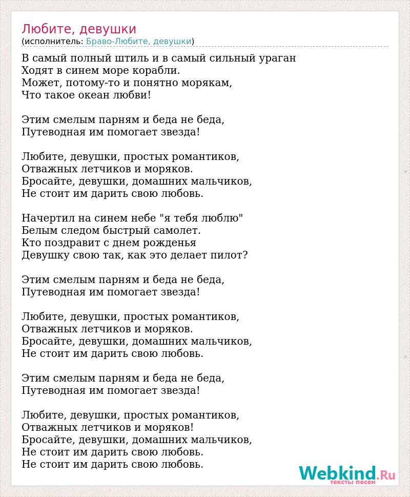 В самый полный штиль и в самый сильный ураган Ходят в синем море корабли. Может, потому-то и понятно морякам, Что такое океан любви! Этим смелым парням и беда не беда, Путеводная им помогает звезда! Любите, девушки, простых романтиков, Отважных летчиков и моряков. Бросайте, девушки, домашних мальчиков, Не стоит им дарить свою любовь. Начертил на синем небе "я тебя люблю" Белым следом быстрый самолет. Кто поздравит с днем рожденья Девушку свою так, как это делает пилот? Этим смелым парням и беда не беда, Путеводная им помогает звезда! Любите, девушки, простых романтиков, Отважных летчиков и моряков. Бросайте, девушки, домашних мальчиков, Не стоит им дарить свою любовь. Этим смелым парням и беда не беда, Путеводная им помогает звезда! Любите, девушки, простых романтиков, Отважных летчиков и моряков! Бросайте, девушки, домашних мальчиков, Не стоит им дарить свою любовь. Не стоит им дарить свою любовь.