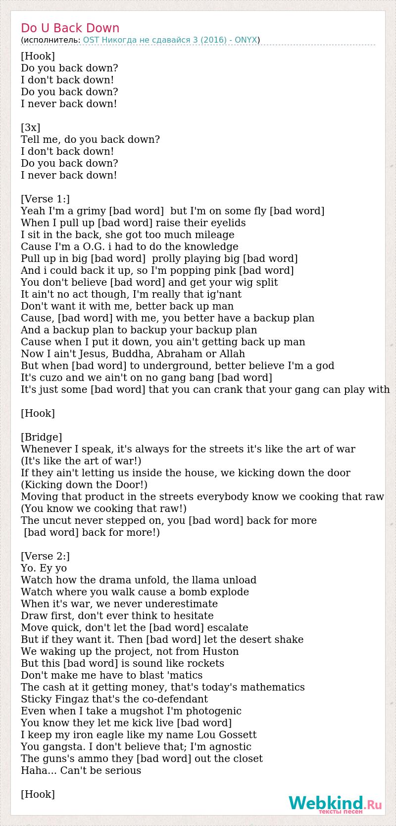 [Hook] Do you back down? I don't back down! Do you back down? I never back down! [3x] Tell me, do you back down? I don't back down! Do you back down? I never back down! [Verse 1:] Yeah I'm a grimy [bad word] but I'm on some fly [bad word] When I pull up [bad word] raise their eyelids I sit in the back, she got too much mileage Cause I'm a O.G. i had to do the knowledge Pull up in big [bad word] prolly playing big [bad word] And i could back it up, so I'm popping pink [bad word] You don't believe [bad word] and get your wig split It ain't no act though, I'm really that ig'nant Don't want it with me, better back up man Cause, [bad word] with me, you better have a backup plan And a backup plan to backup your backup plan Cause when I put it down, you ain't getting back up man Now I ain't Jesus, Buddha, Abraham or Allah But when [bad word] to underground, better believe I'm a god It's cuzo and we ain't on no gang bang [bad word] It's just some [bad word] that you can crank that your gang can play with [Hook] [Bridge] Whenever I speak, it's always for the streets it's like the art of war (It's like the art of war!) If they ain't letting us inside the house, we kicking down the door (Kicking down the Door!) Moving that product in the streets everybody know we cooking that raw (You know we cooking that raw!) The uncut never stepped on, you [bad word] back for more [bad word] back for more!) [Verse 2:] Yo. Ey yo Watch how the drama unfold, the llama unload Watch where you walk cause a bomb explode When it's war, we never underestimate Draw first, don't ever think to hesitate Move quick, don't let the [bad word] escalate But if they want it. Then [bad word] let the desert shake We waking up the project, not from Huston But this [bad word] is sound like rockets Don't make me have to blast 'matics The cash at it getting money, that's today's mathematics Sticky Fingaz that's the co-defendant Even when I take a mugshot I'm photogenic You know they let me kick live [bad word] I keep my iron eagle like my name Lou Gossett You gangsta. I don't believe that; I'm agnostic The guns's ammo they [bad word] out the closet Haha... Can't be serious [Hook]