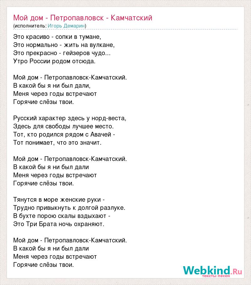 Это красиво - сопки в тумане, Это нормально - жить на вулкане, Это прекрасно - гейзеров чудо... Утро России родом отсюда. Мой дом - Петропавловск-Камчатский. В какой бы я ни был дали, Меня через годы встречают Горячие слёзы твои. Русский характер здесь у норд-веста, Здесь для свободы лучшее место. Тот, кто родился рядом с Авачей - Тот понимает, что это значит. Мой дом - Петропавловск-Камчатский. В какой бы я ни был дали Меня через годы встречают Горячие слёзы твои. Тянутся в море женские руки - Трудно привыкнуть к долгой разлуке. В бухте порою скалы вздыхают - Это Три Брата ночь охраняют. Мой дом - Петропавловск-Камчатский. В какой бы я ни был дали Меня через годы встречают Горячие слёзы твои.